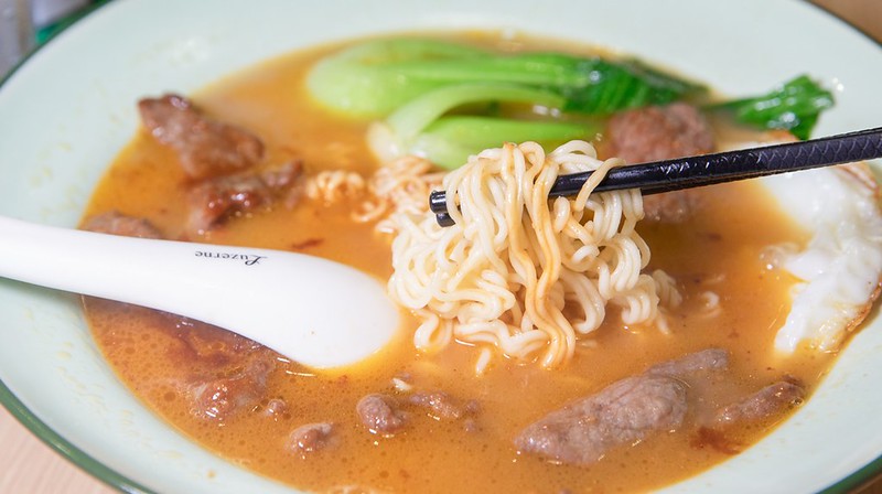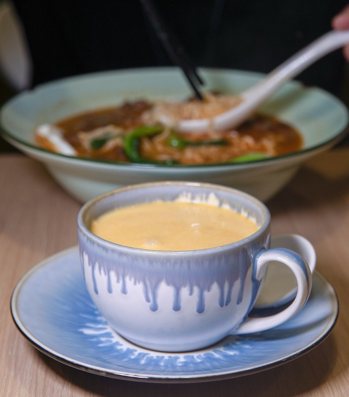 麵體我選了新的細麵,吃起來帶著我喜歡的微咬勁,有一點像生麵又沒有鹹味,咀嚼端也能嚐到湯頭的鮮和緩緩而出的麵香。