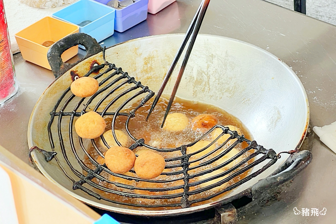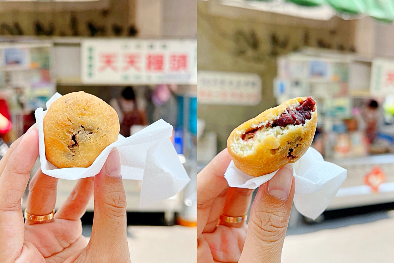 經營74年的老攤位,直到現在還是堅持手工現作,每一顆都是現場手工捏製,人多的時候需要花點時間等候。一邊正在賣力的擀饅頭皮,一邊細心的包裹紅豆內餡,再小心翼翼地丟進油鍋裡小火慢炸。為了維持沒有油耗味,更是2-3小時更換新油。