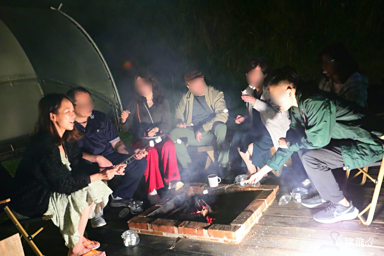 晚餐後最特別的是圍繞著營火烤棉花糖這活動了,一群初次見面的朋友因為這樣聚在一起聊起來啦!夜裡的氣溫驟降,用暖和的營火烤著甜滋滋的棉花糖,充滿樂趣。