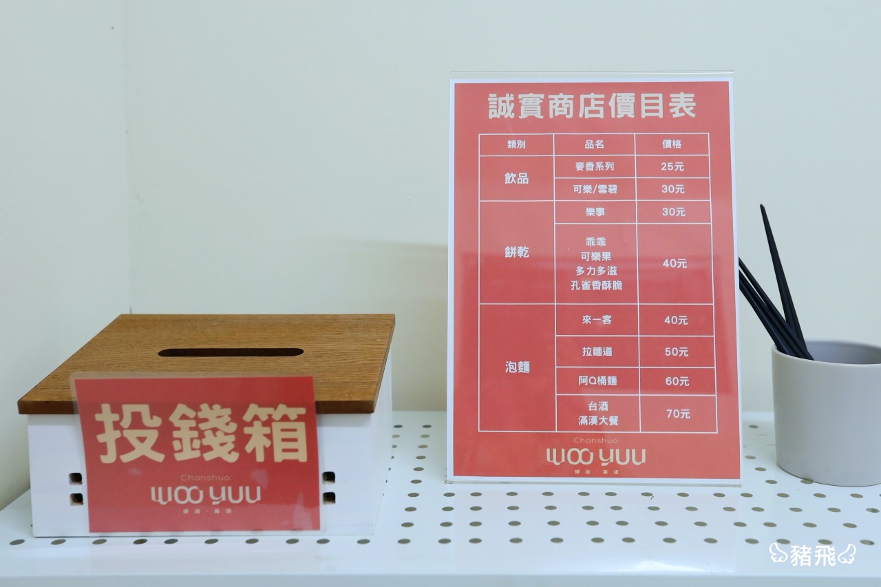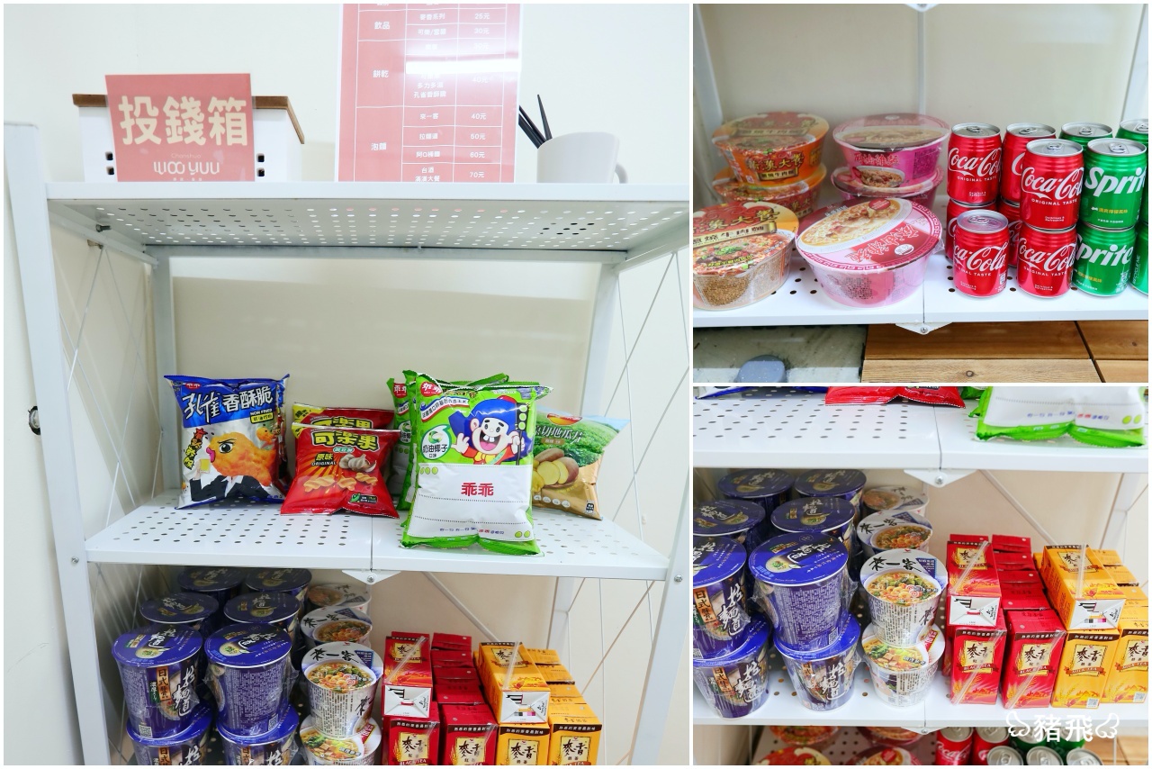 ▲晚上肚子餓還有泡麵、零食、飲料可以誠實商店購買,自己投幣就行囉。這個貼心準備讓人覺得窩心,豬飛就是沿路忘記到便利商店買泡麵,一直心心念念,沒想到園區也有得買。