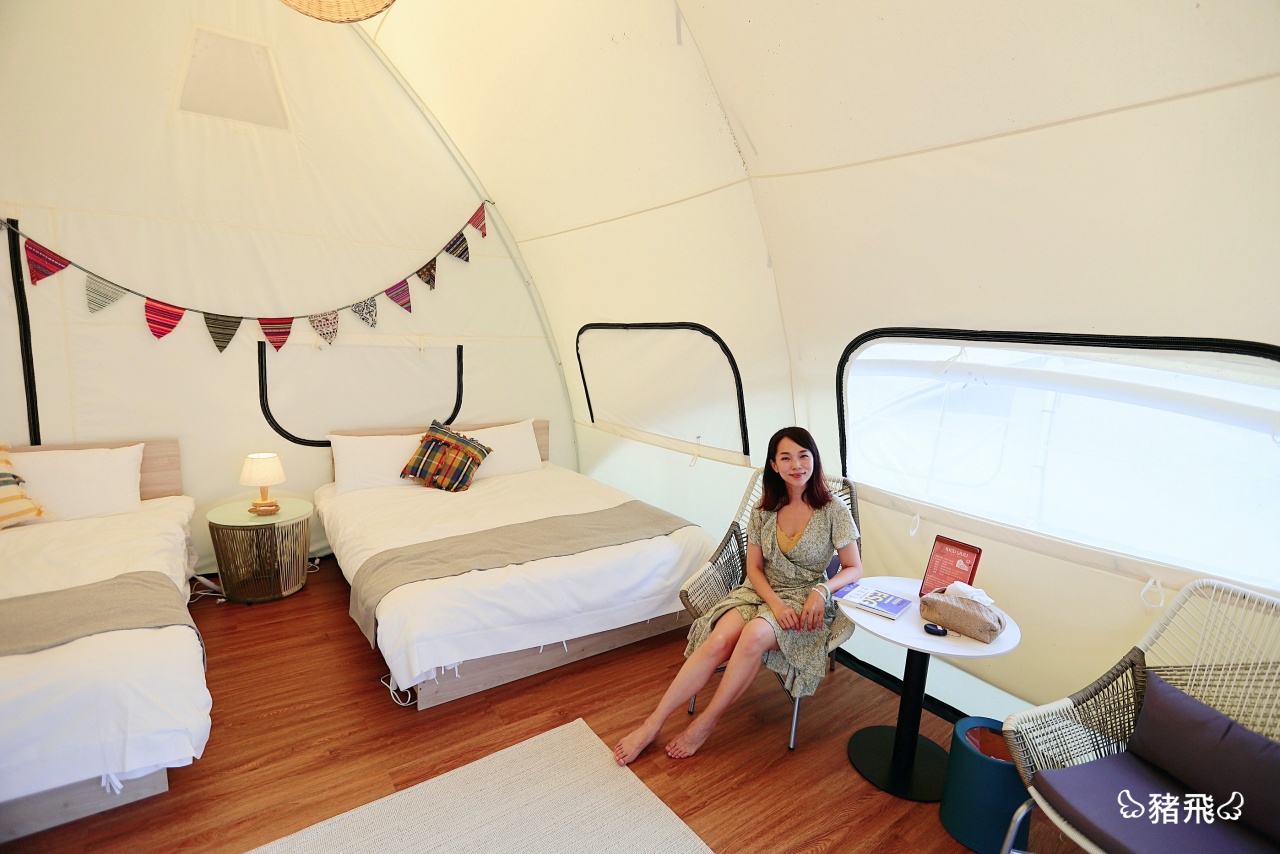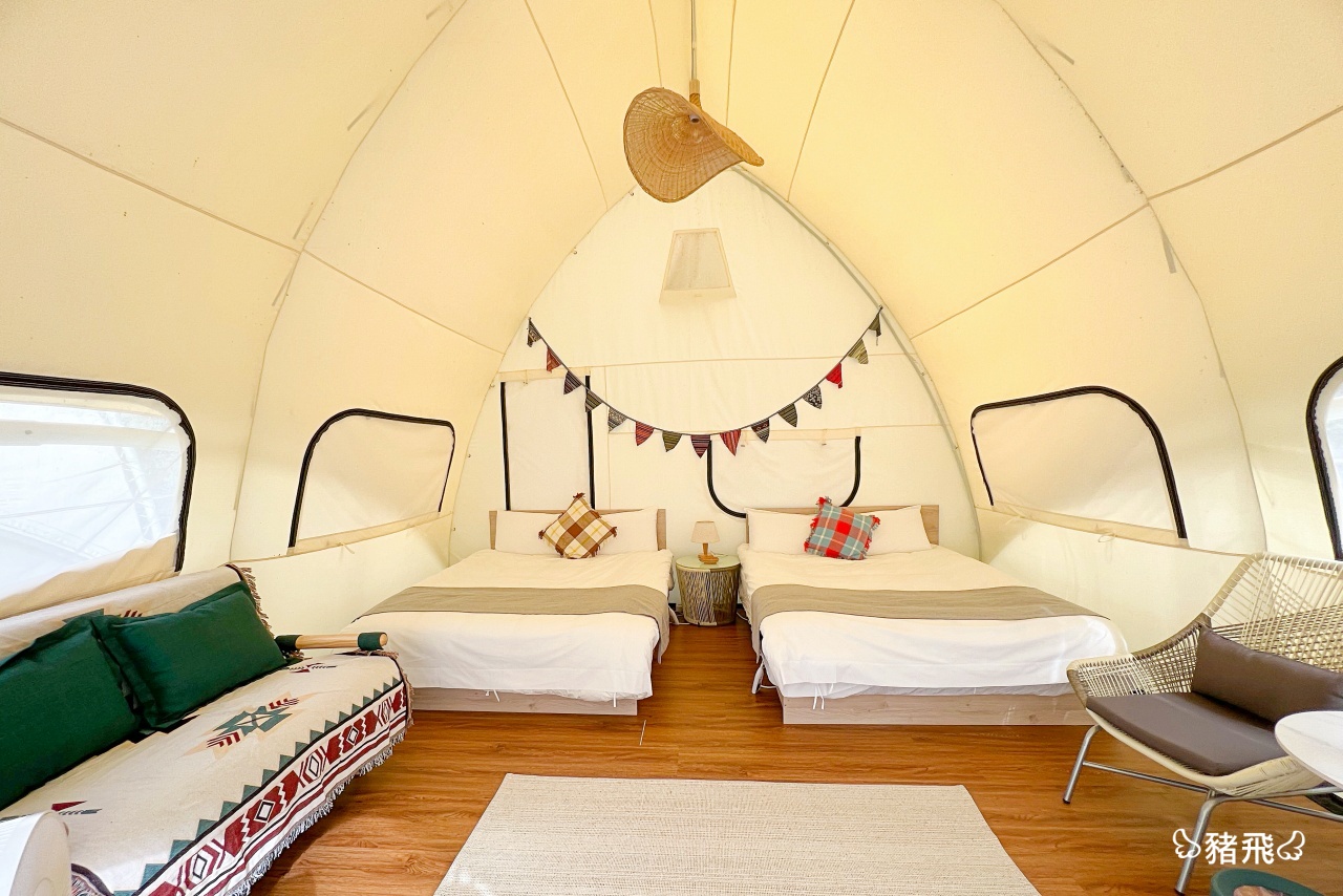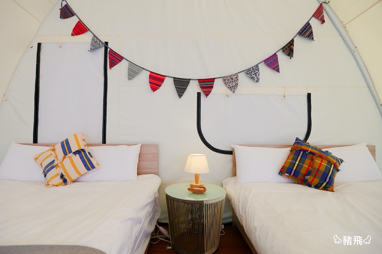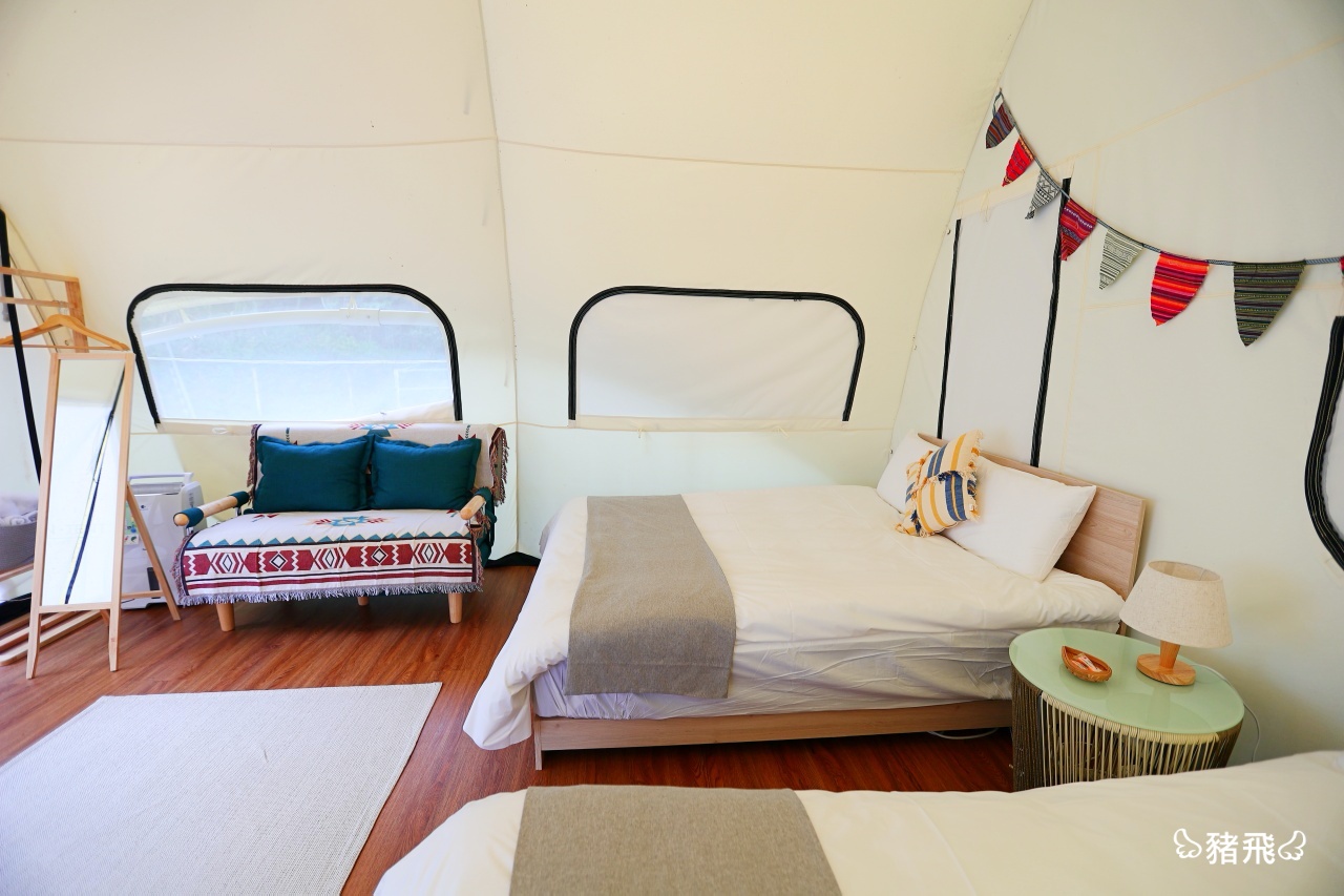 純白色的帳篷顯得寬敞舒服,帳篷內的空間很大,放置兩張雙人床,還有一張摺疊沙發,最多可以入住5人。進入帳篷先感受一下床的舒適度,軟硬度適中,枕頭支撐度也很剛好,是好睡的床!可以感受到蟬說的用心。我跟漢斯先生每次出門最重視的就是床的舒適度了,能一覺到天亮是整個旅程的加分重點。另外還有全身鏡、兩張藤椅,雖然是帳篷,但應有盡有。