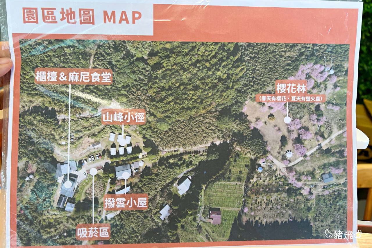 ▲ 入住時候櫃檯會提供園區地圖,就如同照片這樣大的範圍。從帳棚區(山峰小徑)走過去約5分鐘就可以抵達櫻花林。櫻花林在3月春天的時候會有櫻花、5月初到5月底會有螢火蟲。