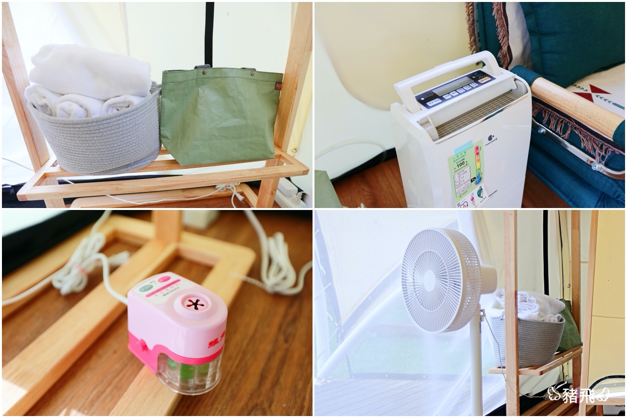 ▲帳篷內提供大浴巾、除濕機、電蚊香、盥洗袋、電風扇、耳塞、排線插座,算是滿齊全的。