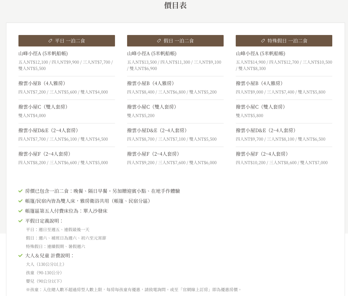被群山包圍的園區有著茂密的綠樹草地,整個園區不算廣大,山峰小徑(豪華帳篷)、撥雲小屋(民宿)、櫃檯&麻尼食堂,算是小巧的露營園區。對於想要安靜度假,不需要太多活動的朋友來說會是個不錯的選擇。由於地處深山,基本上只要進入園區就不會再外出,訂房包含晚餐、早餐的一泊二食,還有簡單的迎賓小點心。帳篷內沒有電視,是遠離3C好好享受難得假期的時刻啊。