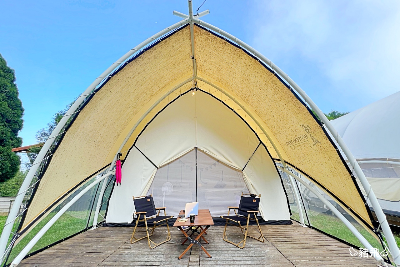 帳篷區共有6帳,在大樹圍繞的樹林間,從園區門口進來就可以看見這6頂帳篷,是園區內最搶手的訂房了。有著茂盛綠草皮,規劃舒適的獨立棧板,每一帳門口放置四張折疊椅、一大張折疊桌。