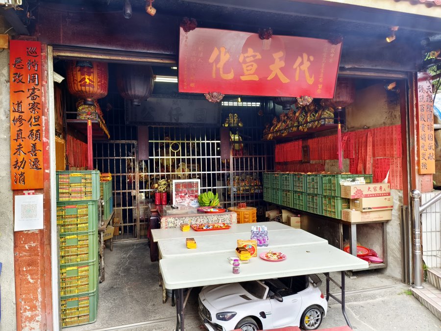 ▼當天果然看到桌上擺放的大多是小朋友喜愛的糖果、飲品甚至供桌下方還有一台跑車,真的很特別~大家記得先參拜一樓萬善爺,再上三樓參拜土地公唷!