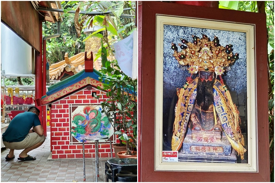 ▼原本土地祠只有四塊大石頭砌成,因後山狀似龍形,土地公右為石頭,所以才命名為「石龍宮」;1950年代因村內有人生病,向土地公祈願後得到庇佑,於是恭塑神像,村民還夢見土地公自稱為是古代武將,因五十多歲死後歸神,還特別交代神像的鬍鬚一定要是黑色的,跟一般常見的土地公像為白色鬍鬚大不相同~真的很特別啊!