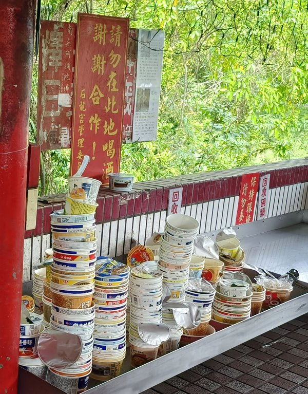 ▼大家可以看到土地公廟其實只有小小一座,但卻非常靈驗,所以香火非常鼎盛!來到這裡的信徒大多帶泡麵來祭祀,原因在於以前賽鴿愛好者及大家樂流行時代,常會有人三更半夜來這裡求明牌,以泡麵止飢;加上多數經商的信徒都是下班後才來拜拜,因為地處偏僻鮮少攤販或店面,就會拿其他人拜完沒拿走的泡麵現泡現吃,經年累月下來在這裡拜泡麵、吃泡麵就成了石龍宮的特色!