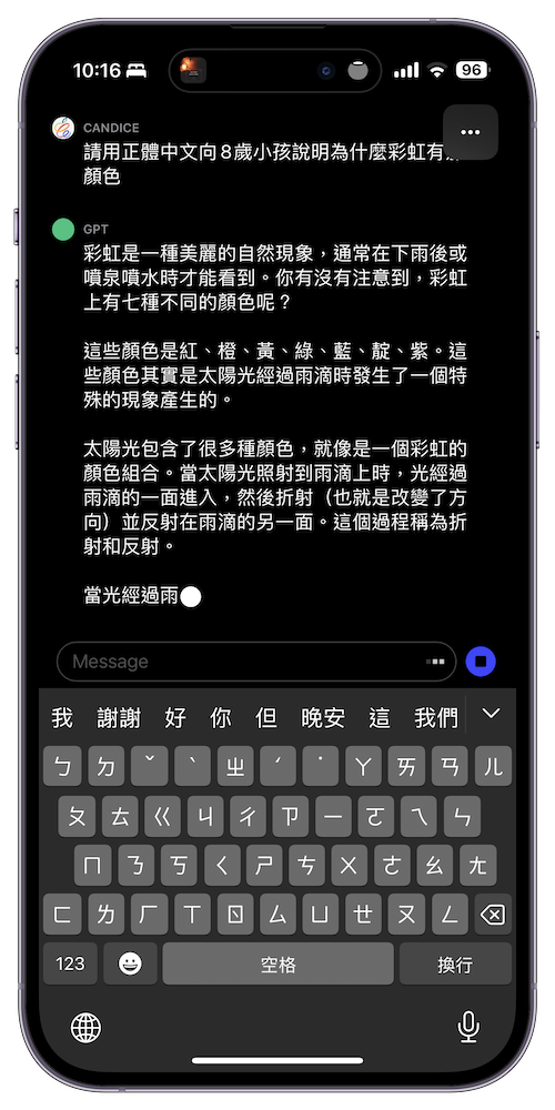 登入後使用介面相當簡單,只要在下方「Message」中輸入想要了解的問題, ChatGPT 就會接著回應。提問中還能列出想要更精細的條件,像是指定要繁體中文、以 8 歲小孩為對象、多少字數等。