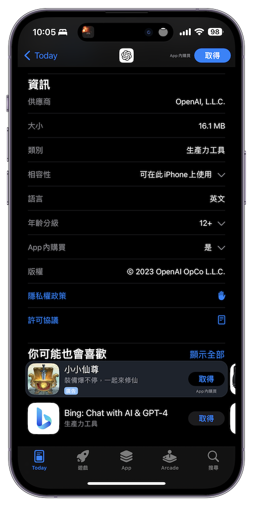 台灣用戶即日起能在 App Store 中搜尋「ChatGPT」或是在排行榜中找到,不過要注意的是正版的 ChatGPT 在 logo 是黑白色系,供應商會顯示「OpenAI」。(小心詐騙版本 ChatGPT app)