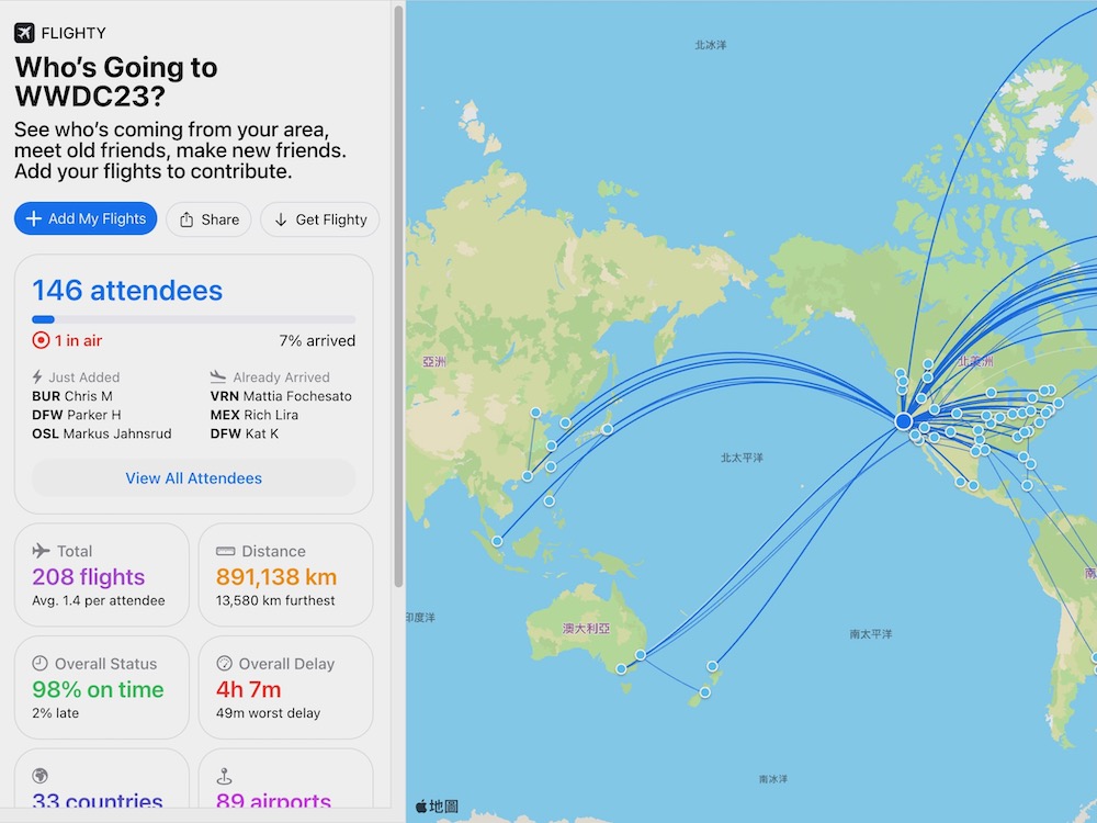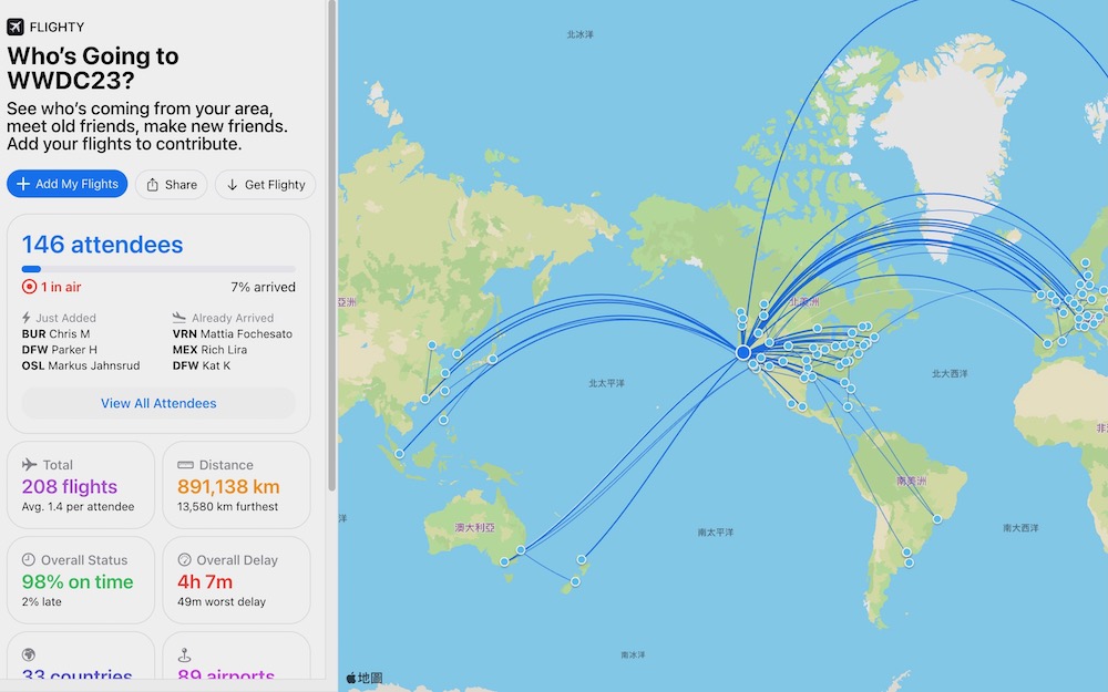雖說我們會看到許多與會者航線的出發、中間與目的地等機場資訊,但每條航線上並不會顯示與會者航班時間、航空公司等個人隱私資訊,僅是提供些飛行距離、世界各地等數據給關心 WWDC 的朋友參考。