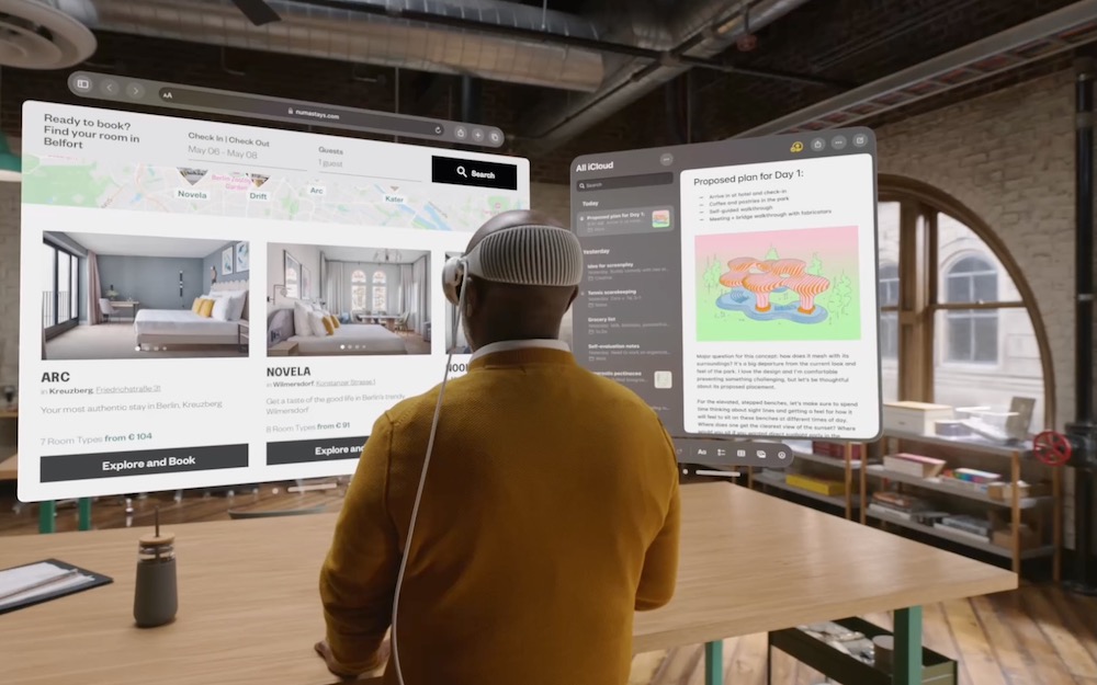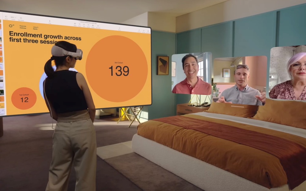 而且如果使用 Apple Vision Pro 進行 FaceTime 通話,會讓通話對方以跟圖片那樣的尺寸大小呈現在眼前,空間音訊更讓聲音聽起來就像從那個人所在的地方發出來的一樣。