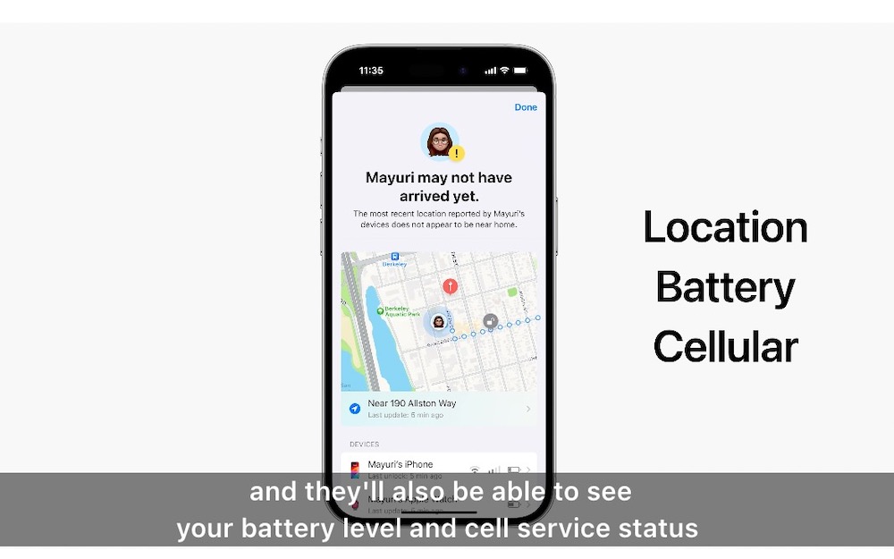 除了在需要時更容易取得幫助外,「平安通報」以隱私權與安全性為主進行設計,並藉由讓我們選擇與誰共享資訊,包括他們設定的目的地和持續時間,確保使用者的自主控制。我們也可以在任何時間結束「平安通報」功能。透用「平安通報」發送的資訊經過端對端加密,因此只有使用者的親友可以讀取,Apple 或任何其他人則無法。
