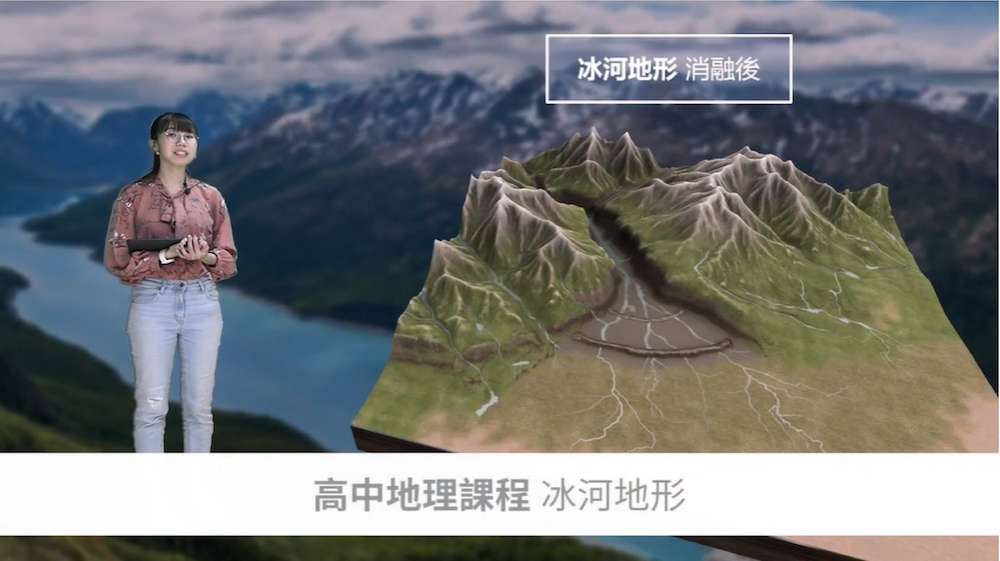 以高中地理「冰河地形」課程篇章為例,此類是在台灣環境中較少見的地形,過往只能透過平面教材理解,但透過MR教育疊層系統,可以將地形立體化呈現,還可透過動畫形式,加快理解冰河形成原理與成因,讓學生以多面向的視覺內容了解抽象事物,提升學生參與感、專注力與理解力。
