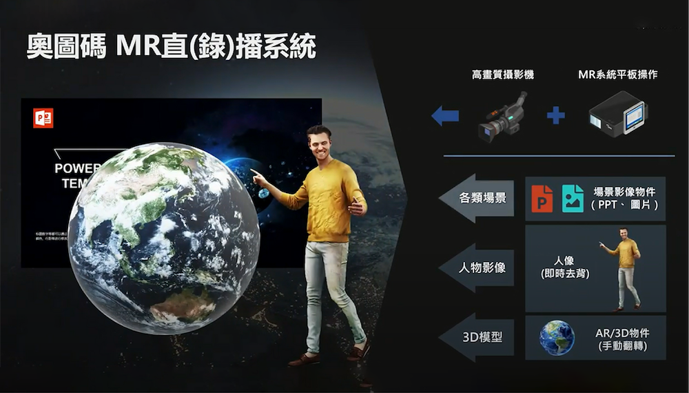 目前南一書局提供國中自然地球科學、國中自然生物、高中地球科學、高中地理四個主題包,共計 15 個課程,每一課程主題包內含有 MR 教學影片、動畫、教學用簡報、教案與學習單,讓老師可以使用登入網站,使用新型態的教材進行教學。在使用上,老師僅需透過平板設備,即可於課堂中操控使用 MR 技術量身打造的教材,包含圖片、影片與簡報頁面等,系統也提供老師自己錄影、編輯功能,可執行放大、縮小、旋轉功能之 AR 3D 物件並結合即時人像攝影無幕/綠幕去背功能,可將講者的身影經由奧圖碼的影像疊合技術交融於虛擬場景之中,以更活潑的方式進行講材介紹。