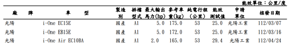 這次推出的新車款預計為銷量最好的 i-One 系列,在能源局 3、4 月核發資料中可看到共有三款車送驗,分別為兩款 i-One 與一款 i-One Air,型號與規格都與現行車款不同。i-One 系列型號為 EC15E 與 EB15E、i-One Air 型號為 EC10BA。