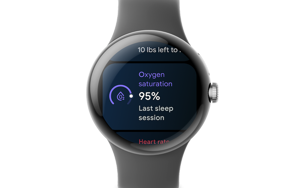 Pixel Watch 將能夠查看血氧濃度 (SpO2),幫助用戶辨識在睡眠期間的血氧濃度變化,血氧濃度變化可能會影響睡眠品質。另外,透過長時間追蹤血氧濃度的趨勢,也能夠有機會讓你察覺關於自己在活動力、壓力和整體健康的變化。
