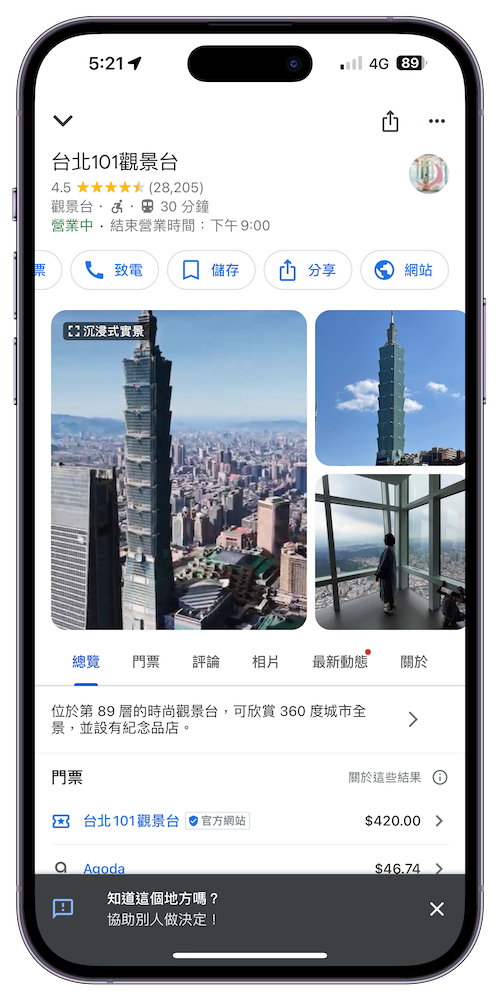 Android 與 iOS 用戶只要打開 Google 地圖後輸入這 9 個地點後按下搜尋,就能點下景點圖片上方的「沈浸式實景」來開啟「沉浸式實景」功能。