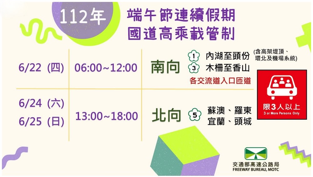 在前往宜蘭、花蓮、臺東的方面,高公局依大數據資料研判,國 5 於端午節連假前一日 9-24 時、連假首日 5-16 時與第 2 日 6-15 時南向南港系統至頭城,以及第 2 日 13-24 時、第 3 日 10-24 時與收假日 9-20 時北向宜蘭至坪林路段,車速將低於每小時 40 公里,行車時間預估為平常的 5-7 倍 (含排隊進入國 5 時間),呼籲用路人可改駛替代道路,南向建議改走台 9 線或 106 乙,北向則建議改駛台 9 線,以避開壅塞車潮。