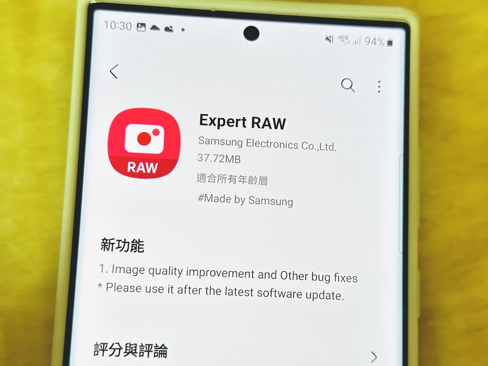 三星 Expert RAW 應用程式僅支援 Galaxy Z Fold4、Z Fold3、Z Fold2、Galaxy S22 系列、S21 Ultra、S20 Ultra 和 Galaxy Note20 Ultra 機種,如果想要更新的朋友可以在 Galaxy Store 中搜尋 Expert RAW 應用程式後更新使用。