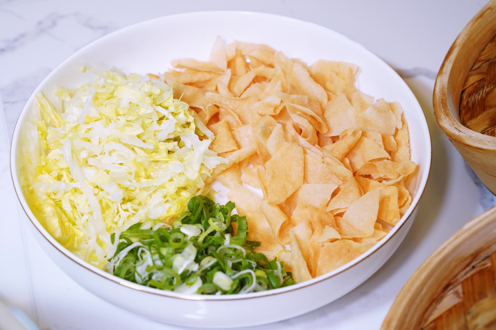 ▼鴨骨粥配料:炸春捲皮、蔥花、生菜絲