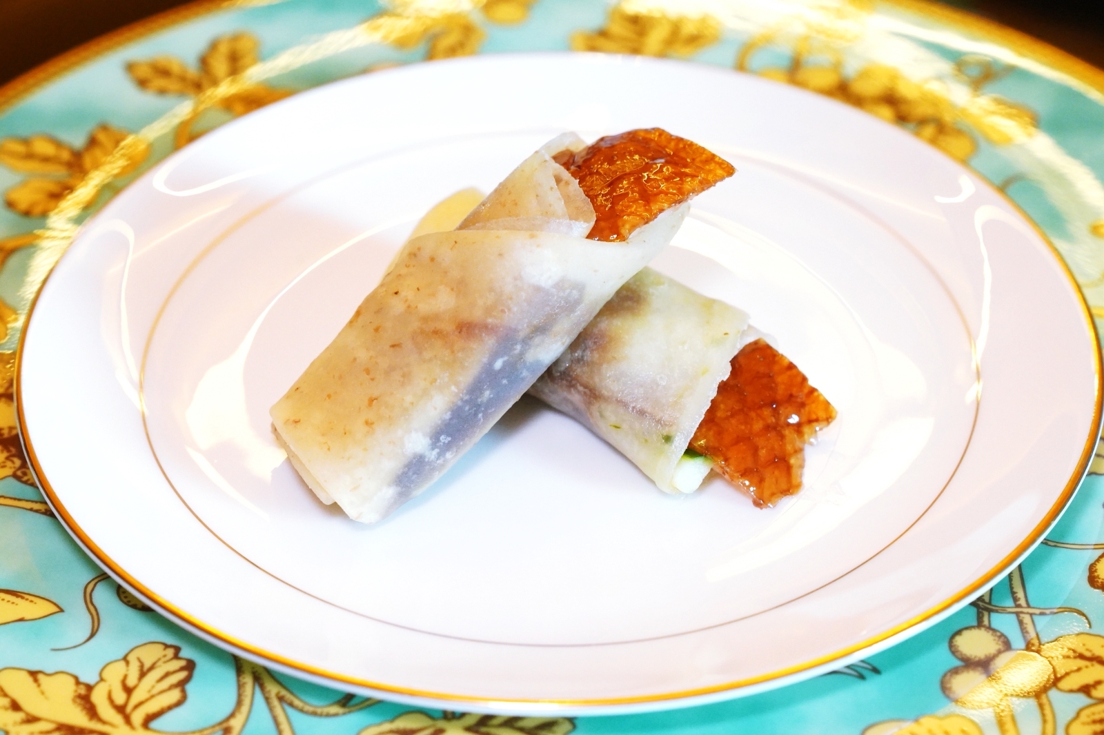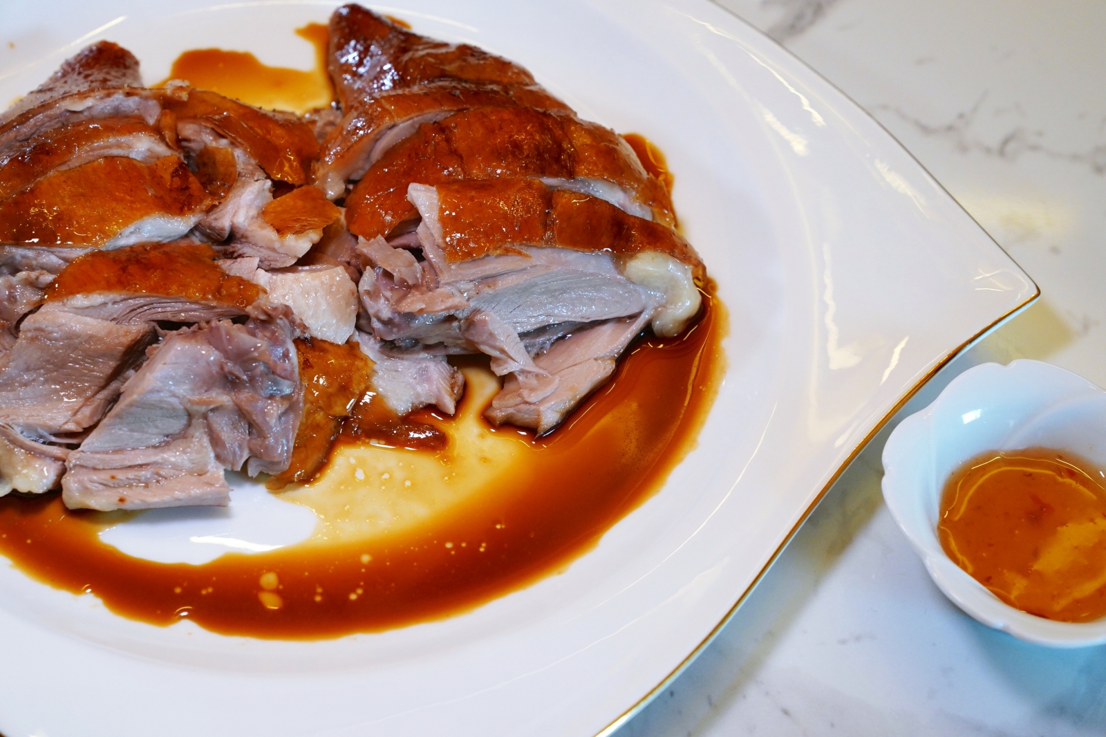 掛爐片皮鴨選用至少養飼養 75 天、重達 3.5 公斤的櫻桃鴨,油脂豐厚,肉質最好、厚實多肉。入口之前先欣賞現場「桌邊片皮秀」,專業的服務人員用刀劃開油亮鴨皮,鴨皮、鴨肉的油香也隨之蔓延,邊看邊聞,口水吞不停。掛爐片皮鴨適合多人享用,人數不夠多時,可點「港式燒味拼盤」,也有鴨肉。