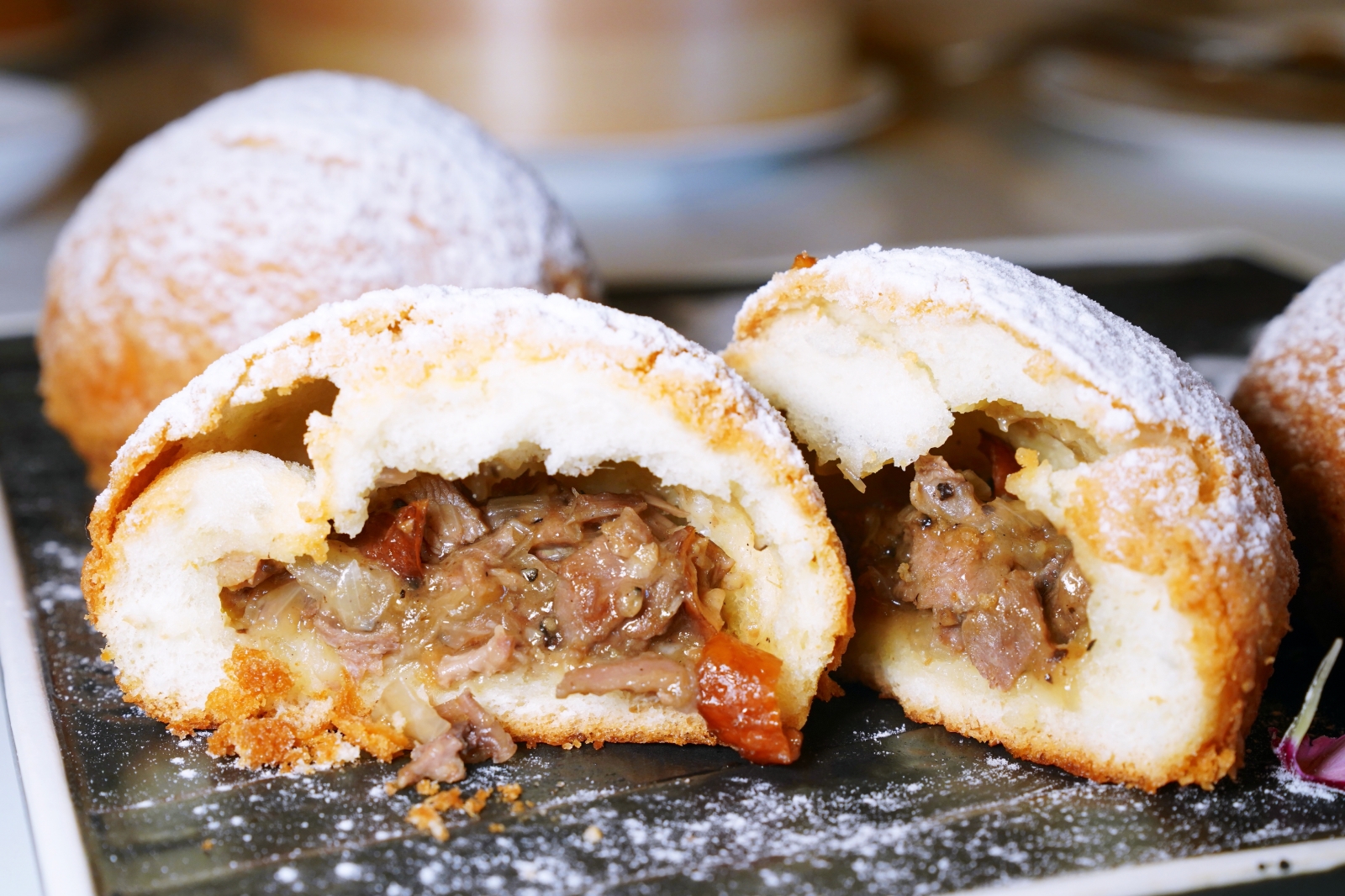 ▼黑椒鴨肉雪山包表層是甜甜的波蘿酥皮,酥皮下是軟麵包,內餡是用切塊鴨胸拌炒洋蔥黑胡椒,是來自鹹甜口味的叉燒包改良版,而酥皮、軟麵包也比叉燒包的厚麵皮來得有新意。