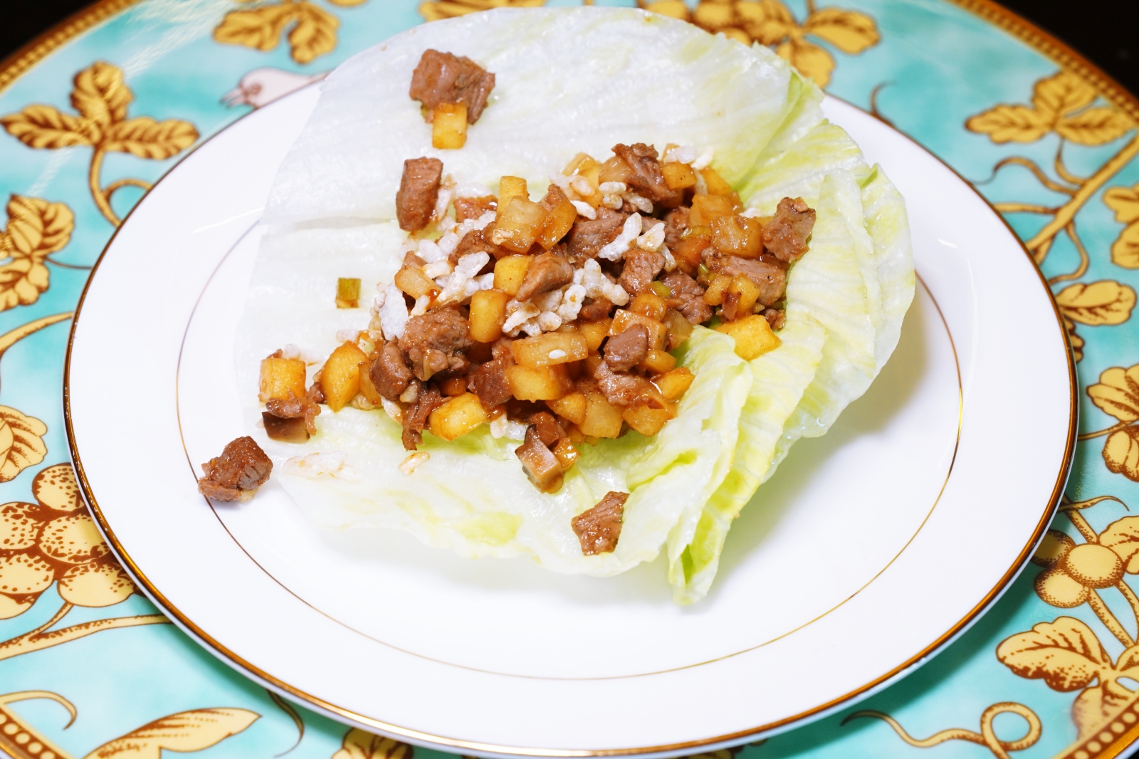 我偏愛吃鴨肉不愛鴨皮,很喜歡清爽的香蘋鴨鬆。 切丁的鴨肉經過拌炒會釋放出油脂,加了蘋果、荸薺、松子一起拌炒,鴨肉油嫩,多了爽脆口感與果香,盤底有乾脆的炒米,用生菜包著吃下,便多了生菜的脆甜感,能當開胃菜。