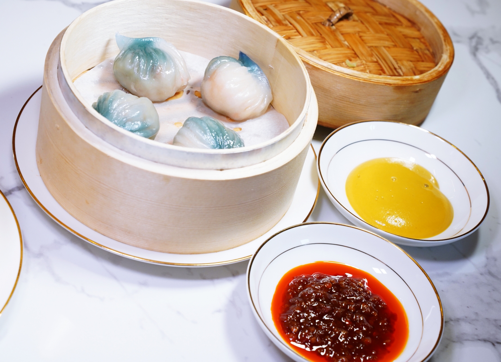 ▼鮮蝦餃外皮的漸層顏色來自蝶豆花植物色素,摺痕捏製得很漂亮,彈性十足的半透明麵皮微透出鮮蝦的顏色,麵皮包著肉漿與鮮蝦,脆彈口感充盈整個口腔。