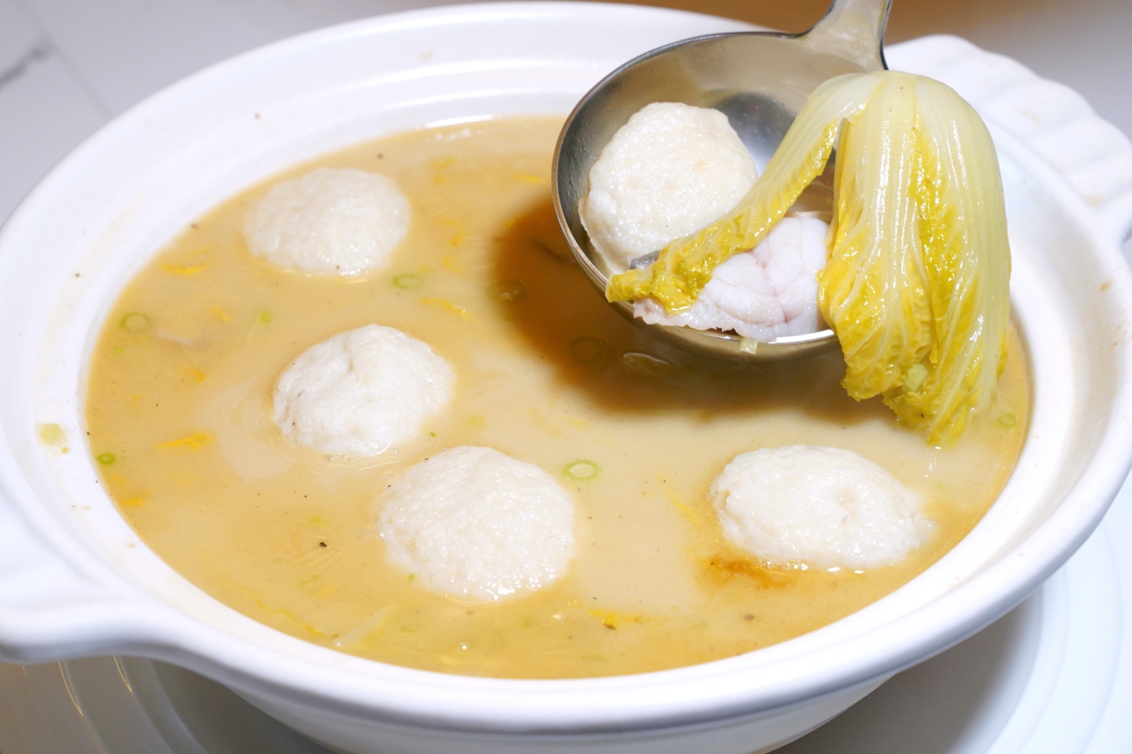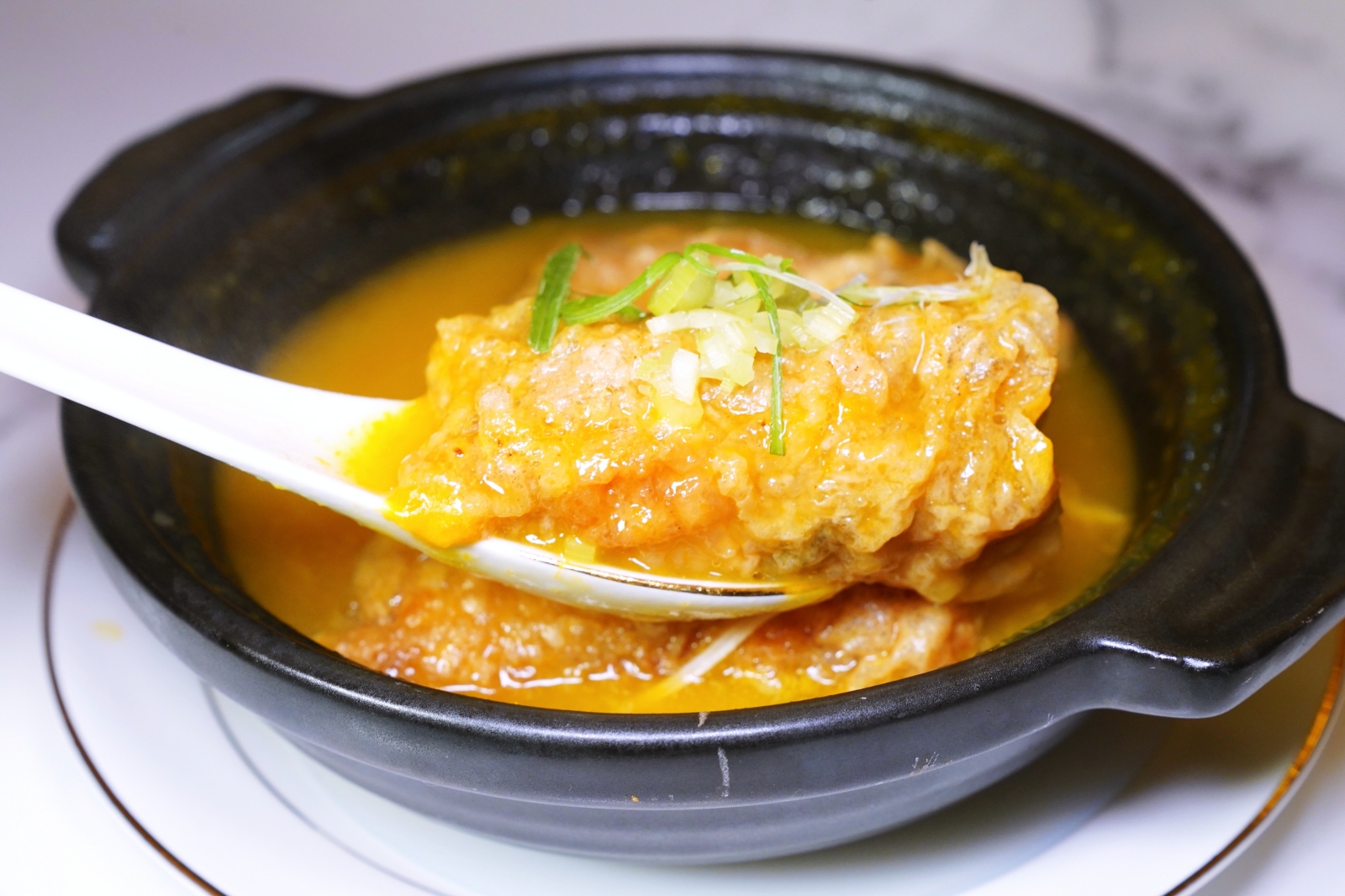 順德手打魚腐煲是傳統的順德菜,魚腐用調味過的綾魚漿製作,放入以鱸魚、老母雞、溫體黑毛豬後腿肉,費時 4小時熬製的雞白湯煨煮,雞白湯濃,但不厚重粘膩,魚腐白嫩軟滑,經過油炸後帶有一點油香。