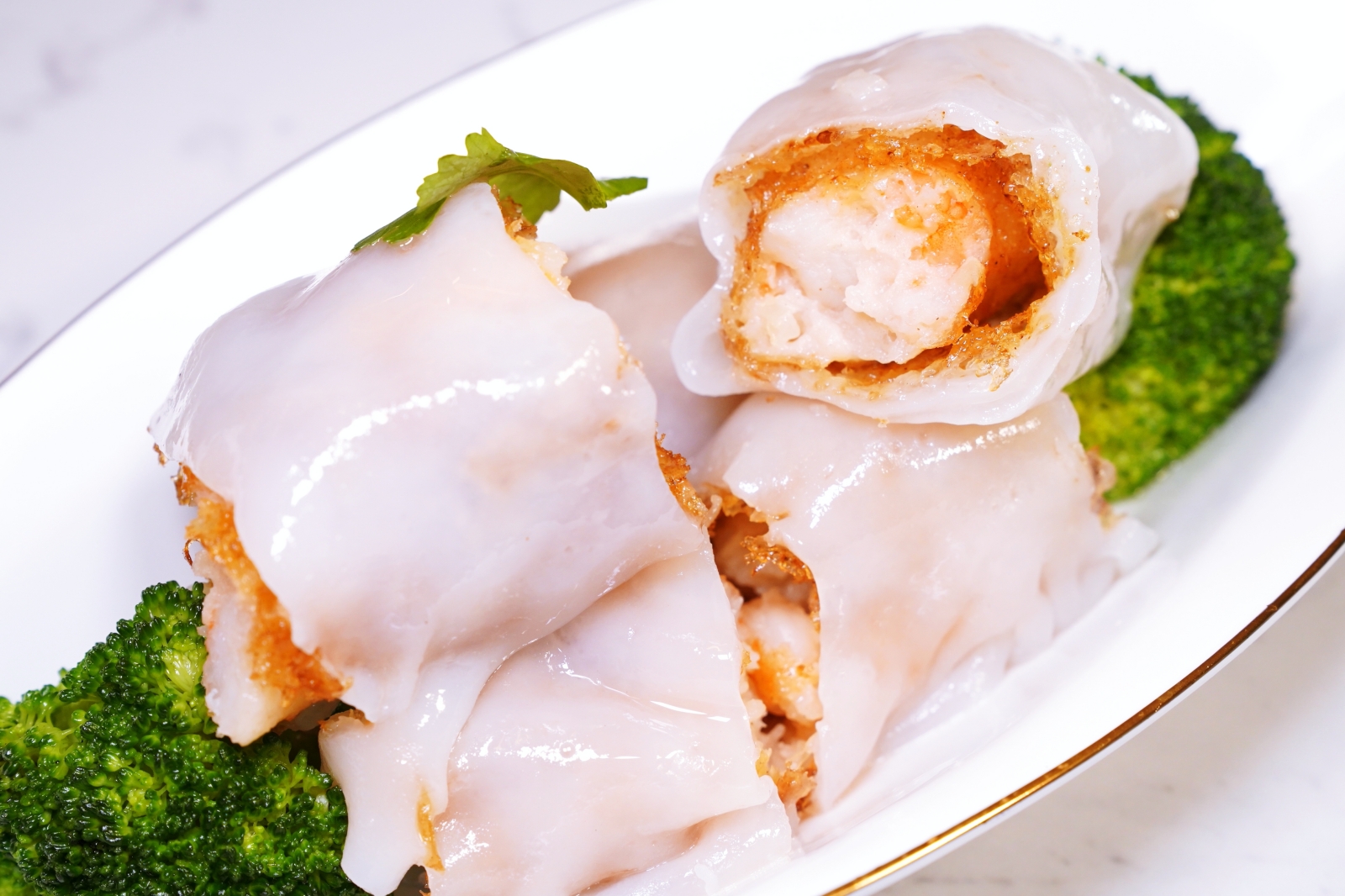 ▼腸粉入口滑腴,裹著脆皮海鮮漿捲,淋上微甜醬汁,吃得出蝦肉、花枝緊實 Q 彈感。