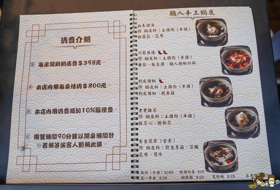 每桌開鍋費398元、內用每桌低消800元、服務費10%、用餐90分鐘