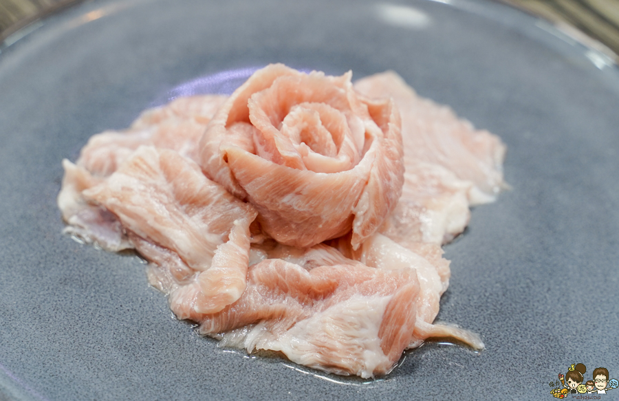 松阪豬肉都是手工切割,擺盤也相當細膩、一朵玫瑰花綻放,油花很細膩