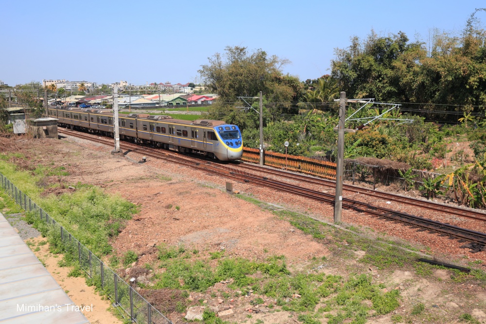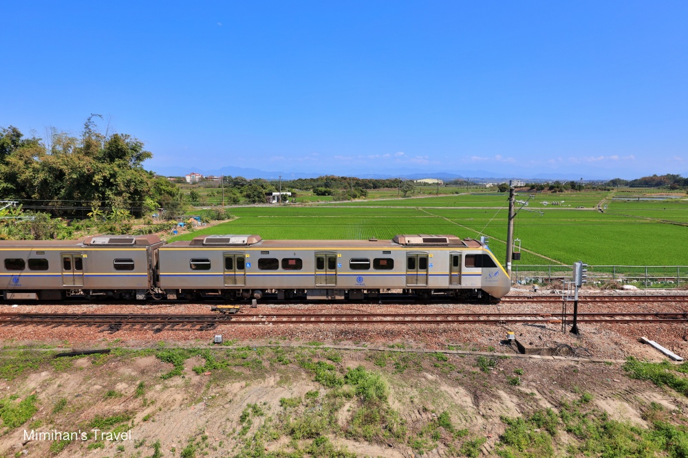 從觀景台還可以看著進出隆田車站的列車,以及遼闊的嘉南平原景象,這季節來還是綠油油,想必金黃稻穗收成的時候又是截然不同的畫面吧!
