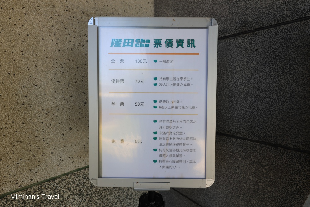 隆田文化資產教育園區門票100元,另外還有優惠票、半票和免費的價格規定。園區裡大人走馬看花約可停留30~60分鐘;小朋友如果有玩跳跳床或互動設施應該可以停更久。有些朋友覺得門票貴,但可能今天只有兩的人來,我是覺得還好,而且裡面的導覽人員志工很親切,倒是如果可以增加更多設施,或者考古區添加內容就更棒了。