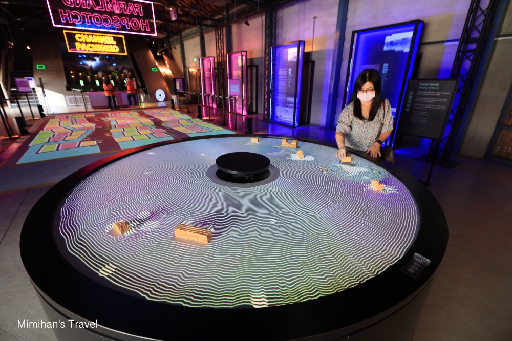 大圳混音場我覺得很特別,玩好久。設計師採集了大圳蔓延16000公里的各種聲音,包含火車、攤販叫賣、民俗祭典、蟲鳴鳥叫等元素,玩的時候用手或是積木把一顆顆從中間射出來的球給擋下來,就能聽到各種不同的聲音。