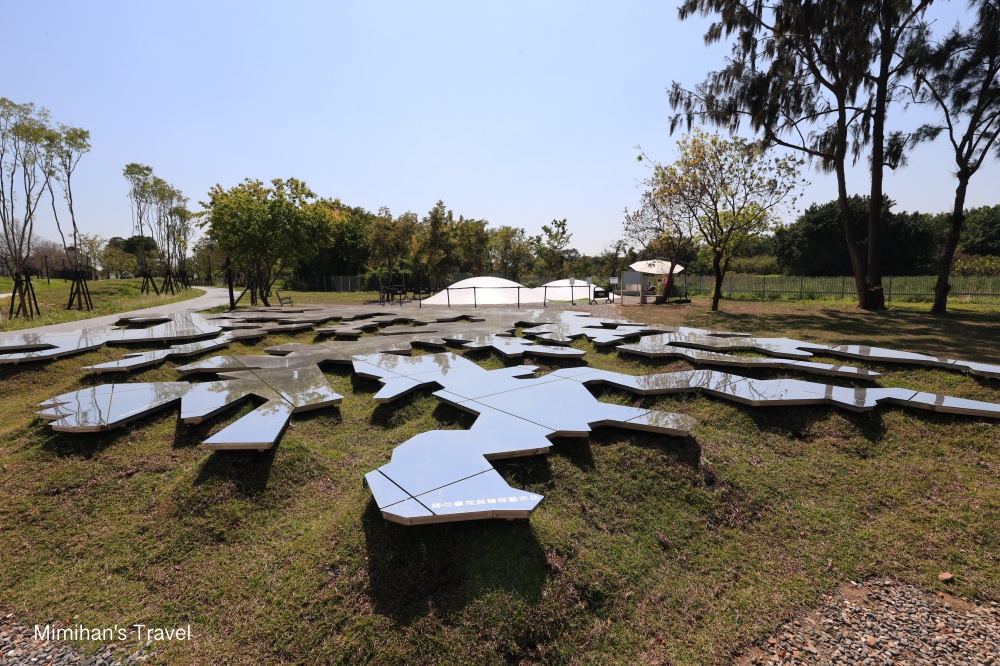 接著往園區後半段走,中間會經過《瞰水丘遊》的公共藝術,藝術團隊以鏡面不鏽鋼呈現整個烏山頭水庫珊瑚潭的水域輪廓,鏡面如同湖面反射的天光水影,旁邊則是把烏山頭水庫每年的消耗水量等比縮小變成彈跳小丘。