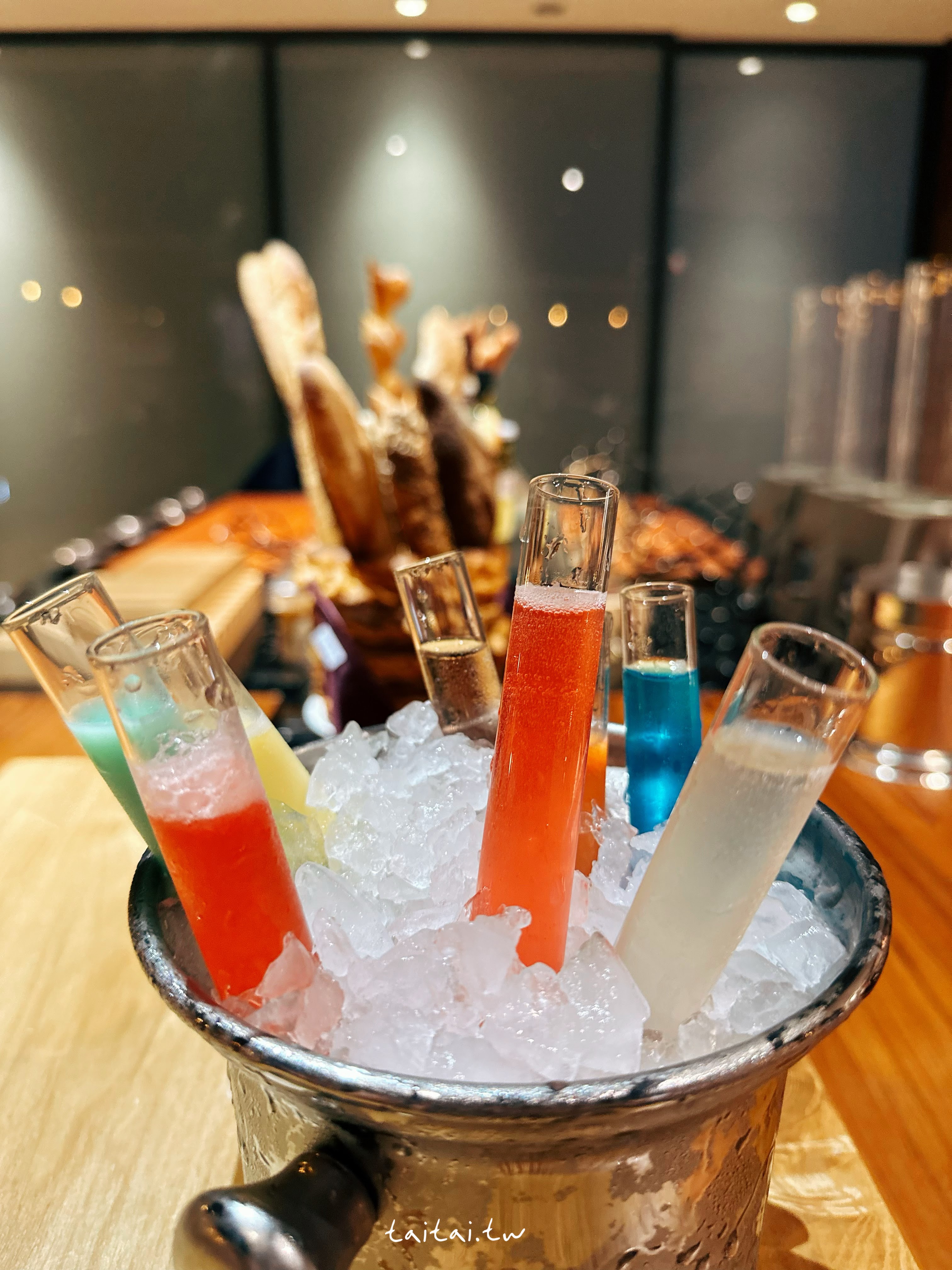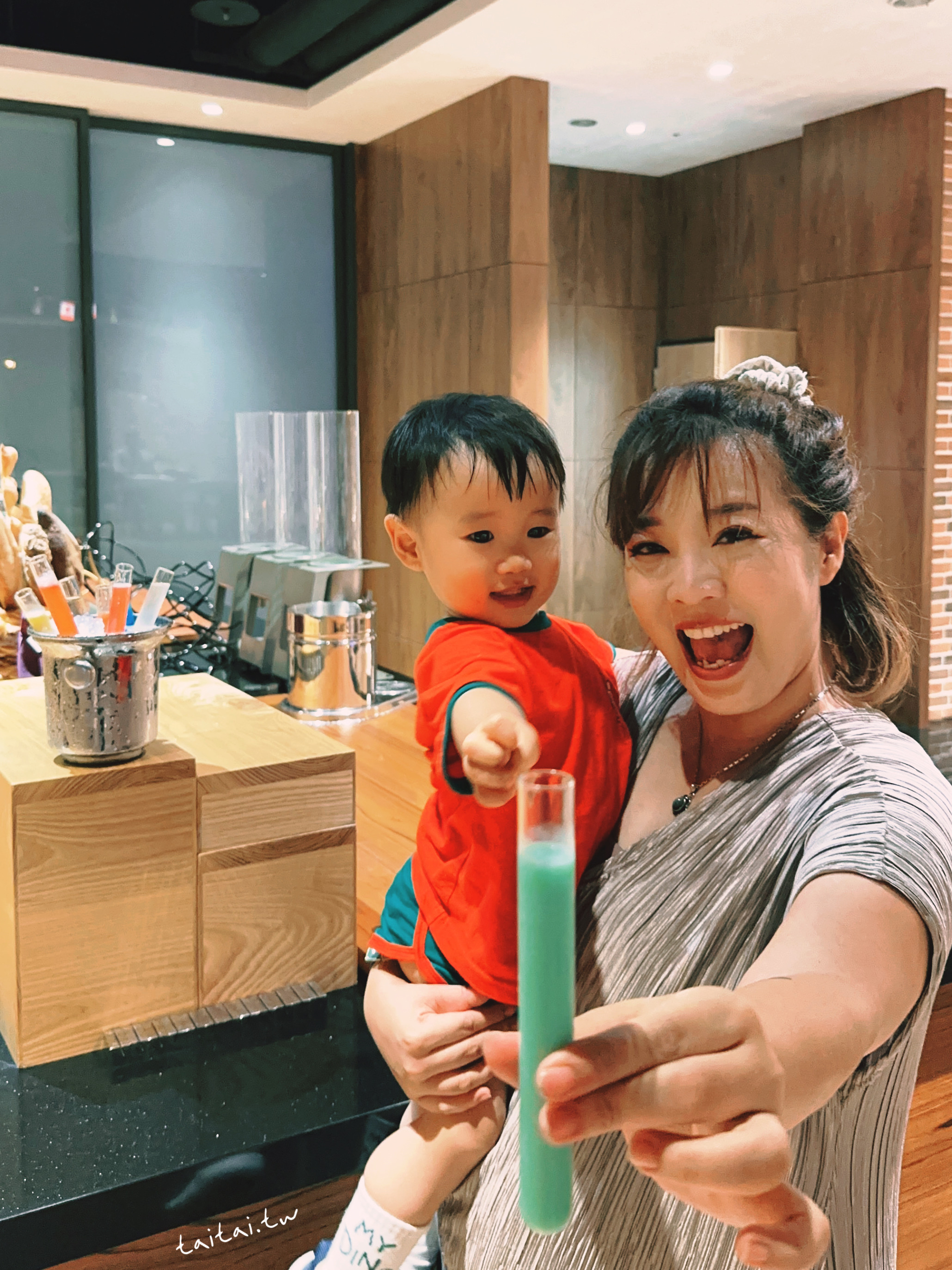 此外也謝謝震大金鬱金香酒店體恤地方媽媽壓力山大,招待我喝調酒,這款調酒好可愛,一根一根試管把不同口味的酒插在冰桶中,口味不盡相同,有的辛辣、有的帶甜味、有的則是大人味好重(我個人稱之為臭酒但游先生喜歡XD),整體來說不太會喝醉,但可以享受微微微微的微醺感。