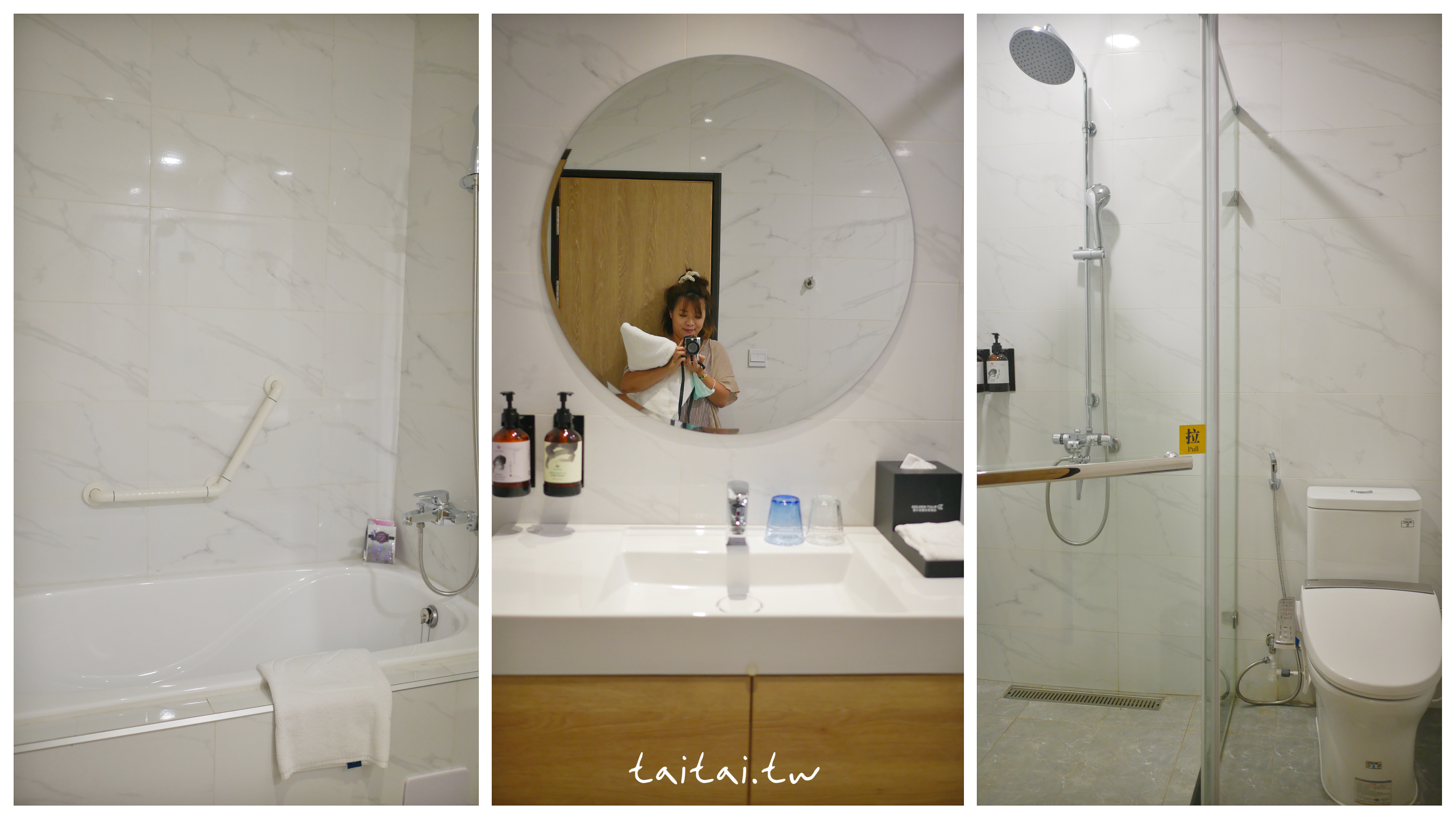 浴室的空間算大,全家人都在浴室裡面一起活動也是OK的,因為有浴缸、我就沒有特別請飯店準備嬰兒澡盆,讓龍哥沖一沖就跟我一起在浴缸裡泡澡,他很開心,因為飯店的蓮蓬頭水柱都很強,他喜歡幫人家洗牆壁,浴缸旁也有安全扶手設施。