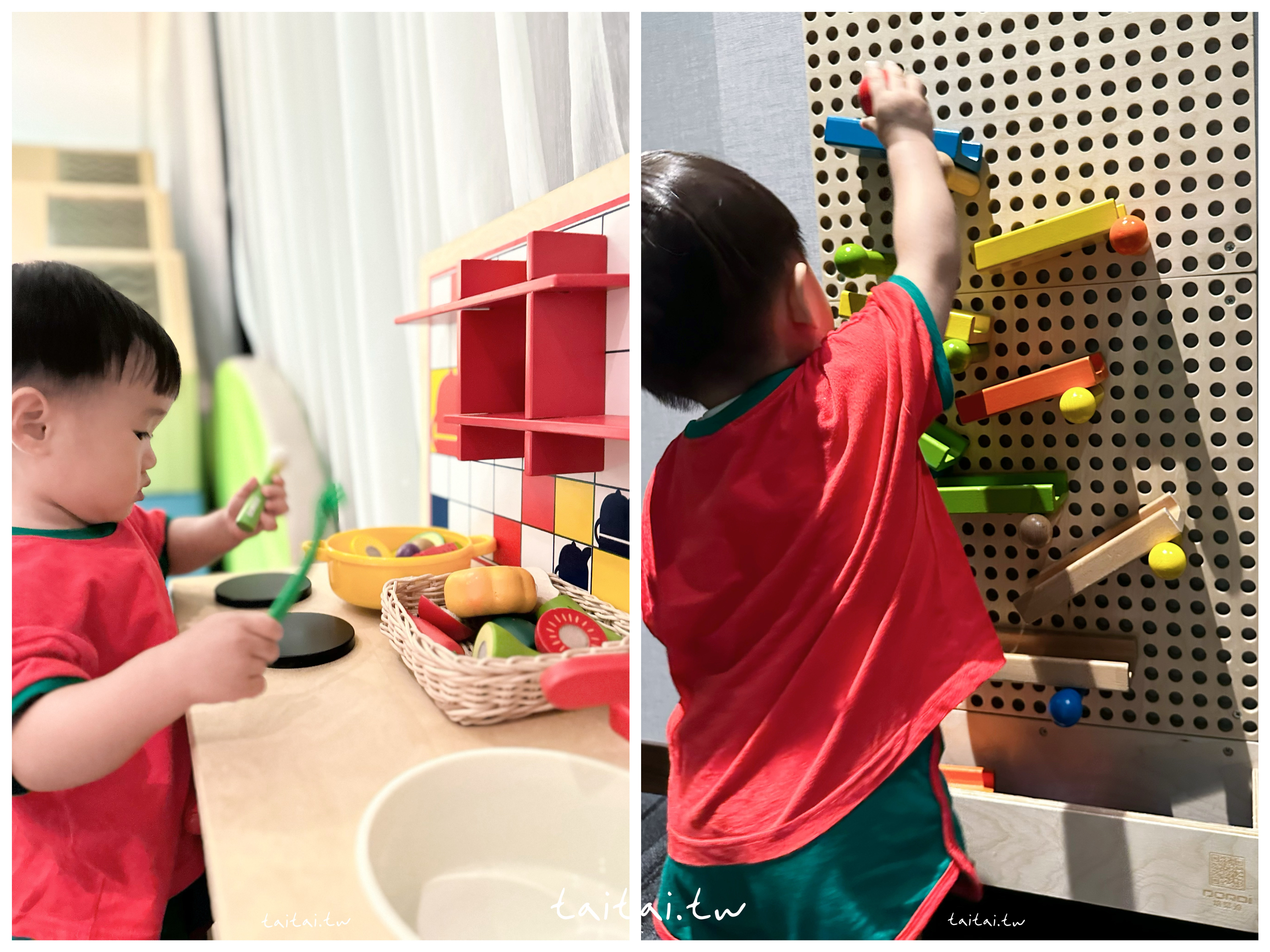 五樓(沒有四樓)則是開放到晚上十點的兒童遊戲室,櫃檯服務人員很客氣的跟我說說是簡易遊戲室,但我覺得剛剛好適合三歲以下的小童,一個蜂巢型的攀爬與滑梯設施、一排樂高牆、一個可以自己組的軌道滾球牆、還有一排廚房組(裡面道具滿多的),大人也可以到一樓借switch上來玩,一次可以借一個小時。