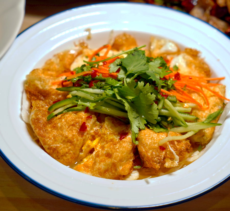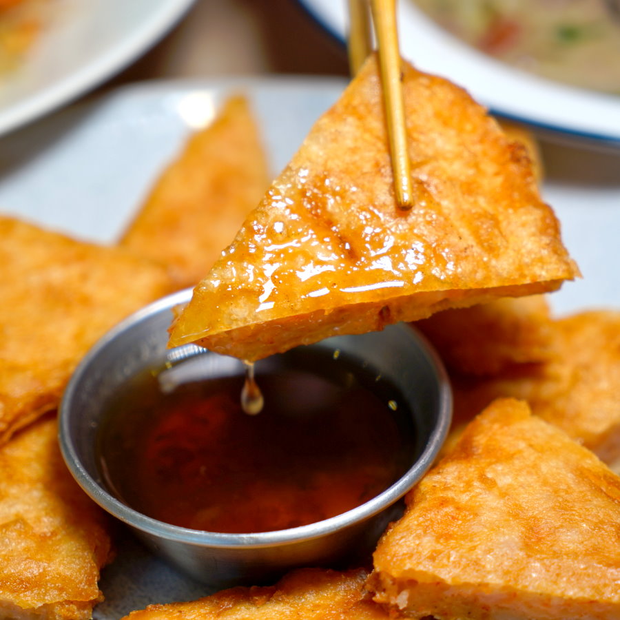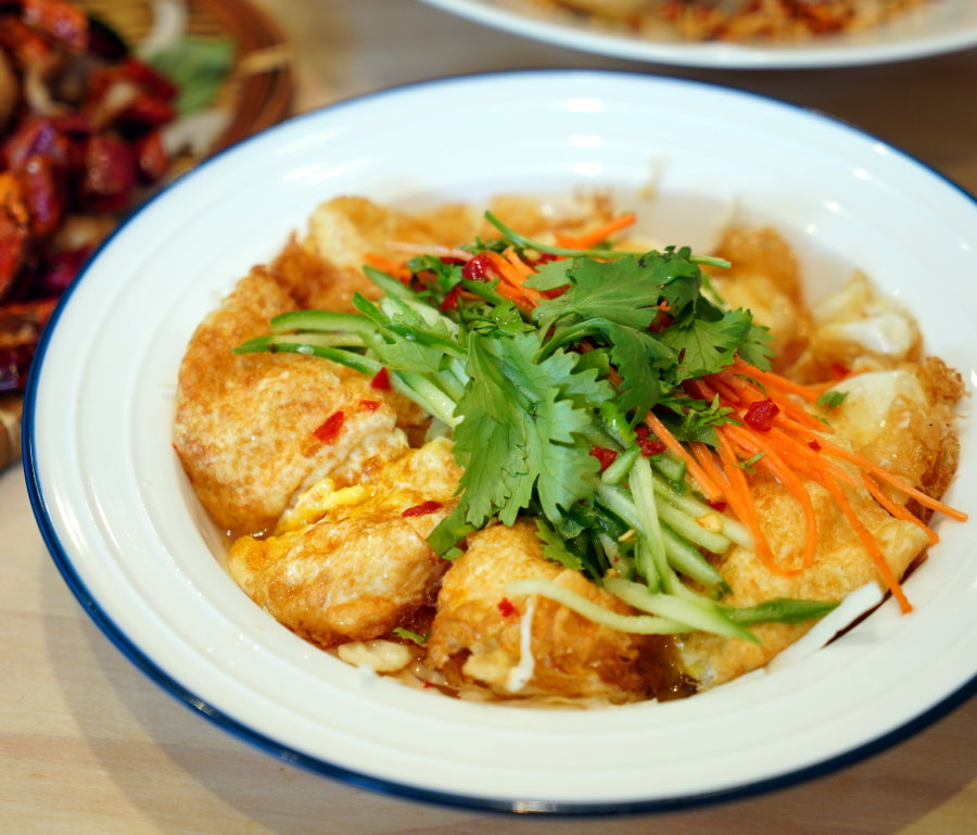 ▼炸過的雞蛋外皮酥脆,裡頭帶點半熟的蛋液,吸附滿滿醬汁精華後,吃起來酸香甜美又開胃,整個好吃到不行。