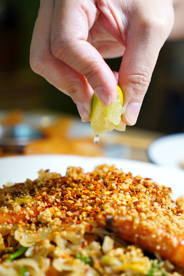 ▼泰式炒河粉,炒河粉搭配鮮蝦、檸檬與滿滿的花生粉、辣椒粉,整盤好料滿滿。
