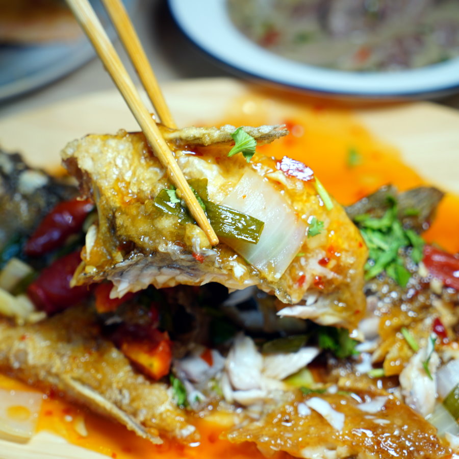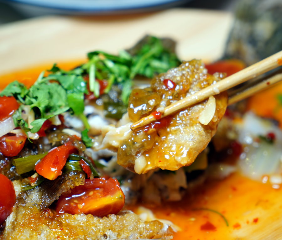 ▼鱸魚肉質細嫩鮮美,酥炸過的魚皮更容易巴附醬汁,吃起來超夠味的!
