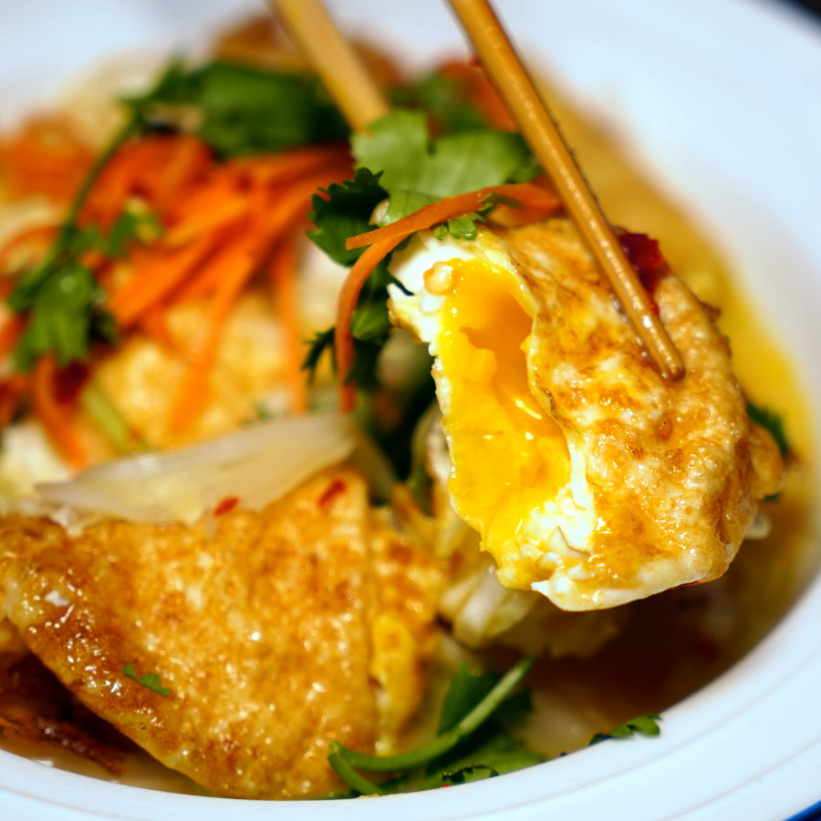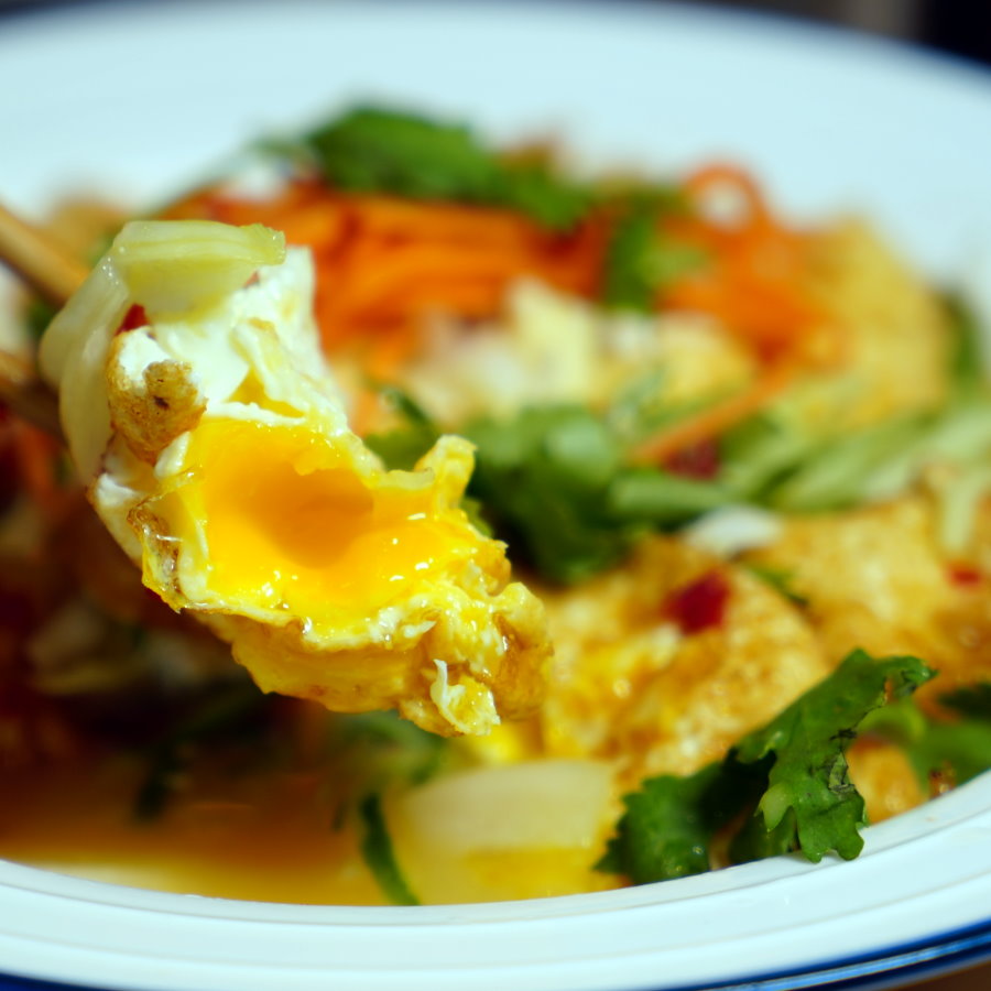 ▼採用炸過的荷包蛋搭配特調泰式醬料,底層舖有高麗菜絲,上頭再以香菜、紅蘿蔔絲、小黃瓜絲點綴,看起來賣相還不錯。