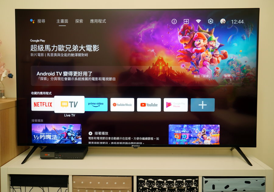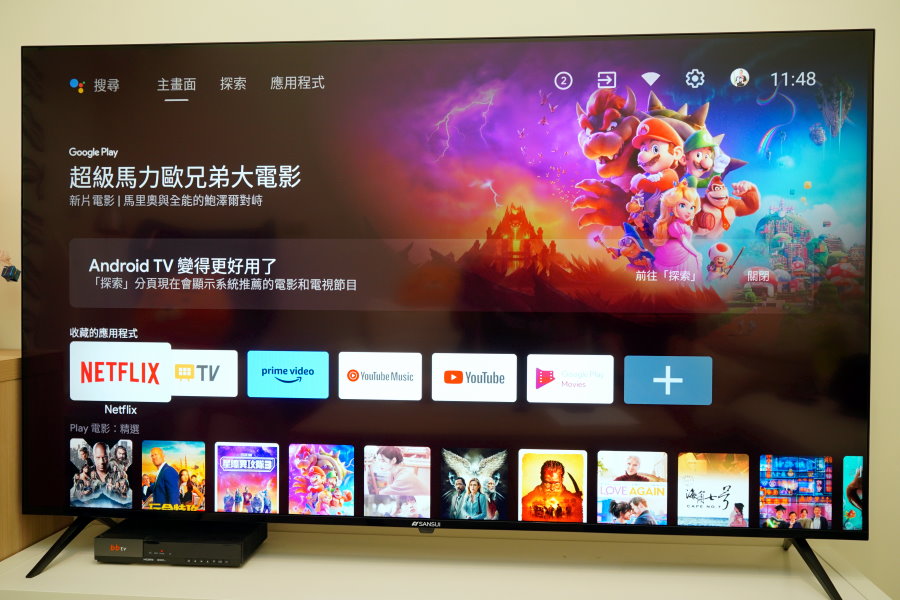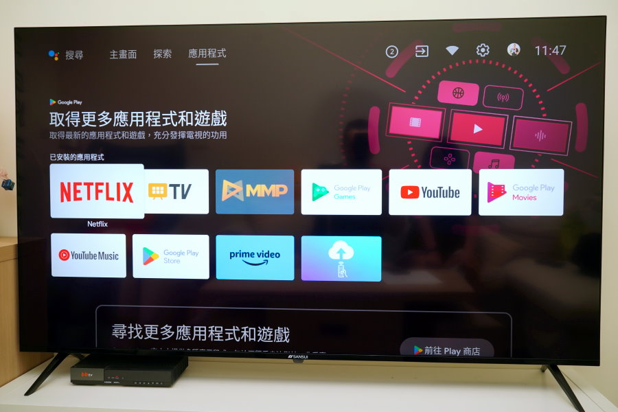 ▼首頁就有內建幾個常用的影音平台,包括Netflix、Youtube、Prime video、Google play等等,除了可以用遙控器一鍵開啟之外,也可以直接將喜愛的應用程式收藏在這裡,之後就不用苦苦搜尋了。