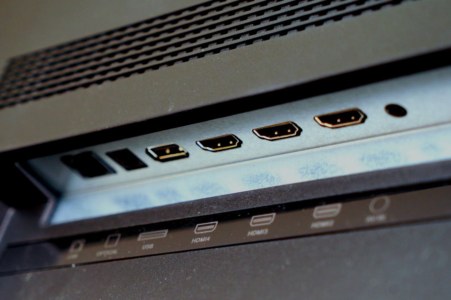 ▼下方也有網路孔、數位音源輸出(光纖)、USB、3個HDMI 、AV IN等插孔,可以外接不同設備使用。