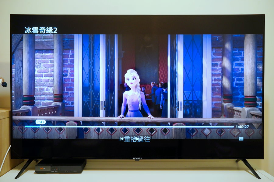 ▼安裝好「SANSUI 山水65型4K QLED量子智慧電視」最開心的莫過於小朋友啦~可以用超大螢幕看動畫,根本就是在家裡的小小電影院!小口愛第一部就點名她最愛的冰雪奇緣,在家看電影無拘無束,不用擔心會吵到別人,還有超棒的影音享受,真的是很幸福啊!