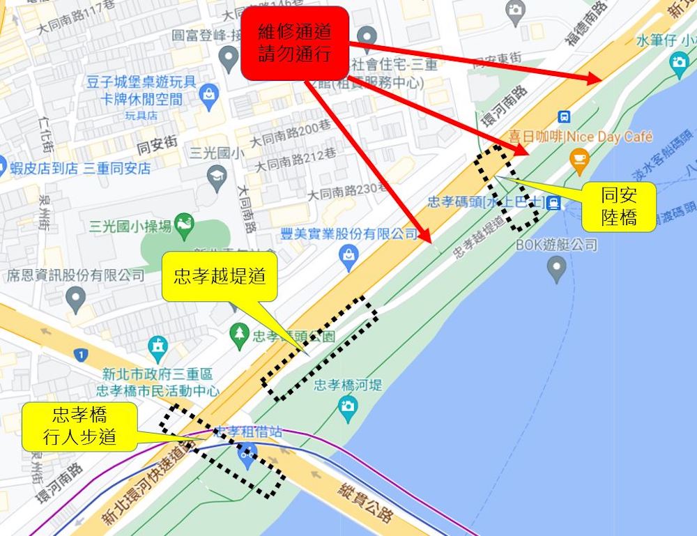 交通局交通安全科科長林碧芬表示,今年大稻埕夏日節屬於中低空煙火展演約 3 分鐘,因此不會實施交通管制,所以如果民眾想要前往忠孝碼頭欣賞煙火,可經由忠孝橋行人步道、正義南路的同安陸橋及忠孝越堤道前往。不過也特別提醒民眾,忠孝越堤道至同安截流站之間有 3 處樓梯是堤防的維修通道,會設置告示牌提醒民眾請勿通行使用,以免發生危險。