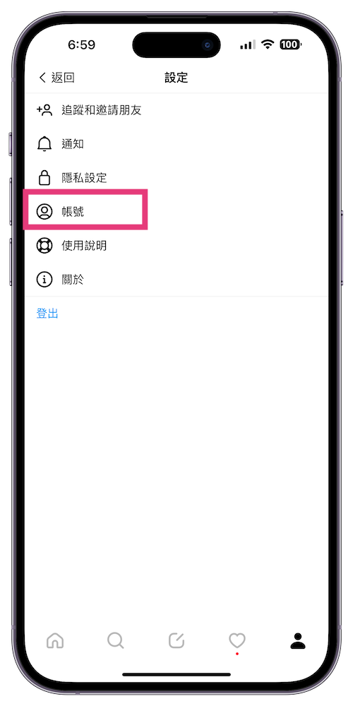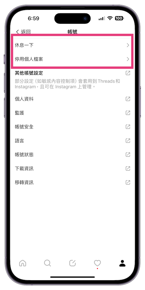 如果是想離開安靜一下,那麼可以從 Threads 的「設定」>>> 「帳號」中來停用自己的帳號。