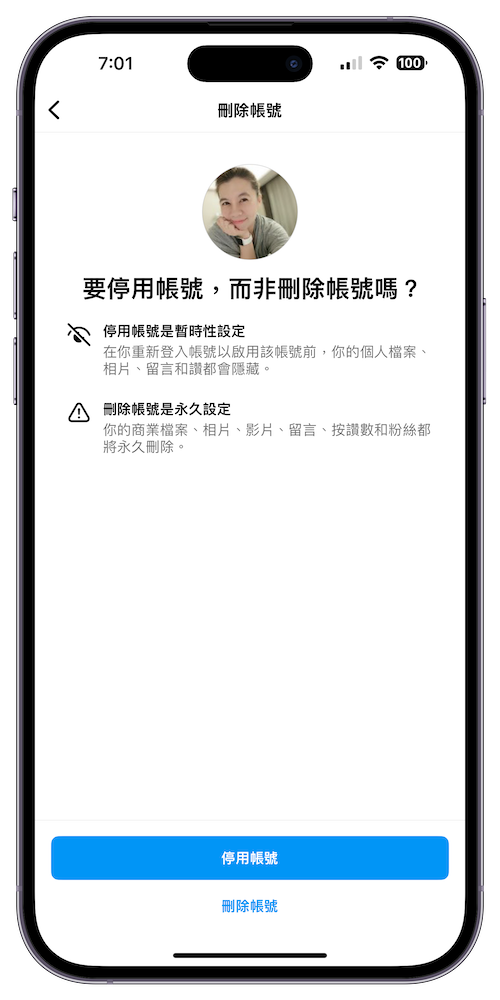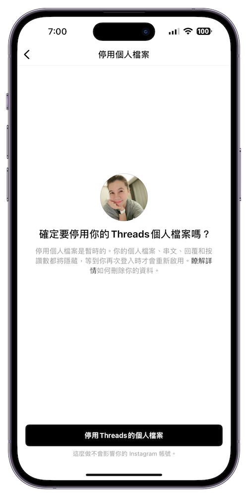 當我們選擇「停用個人檔案」後,貼文以及與其他用戶貼文的互動將不會顯示在 Threads 上,直到重新啟用個人檔案為止。停用 Threads 個人檔案並不會刪除 Threads 資料或影響自己的 Instagram 帳號。